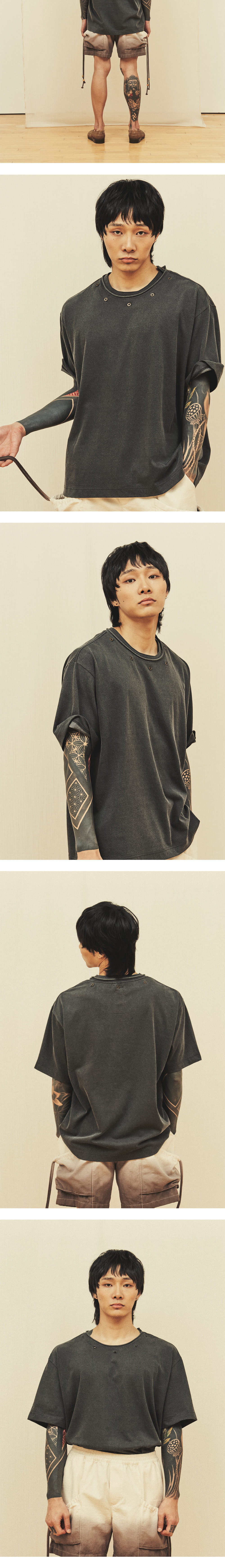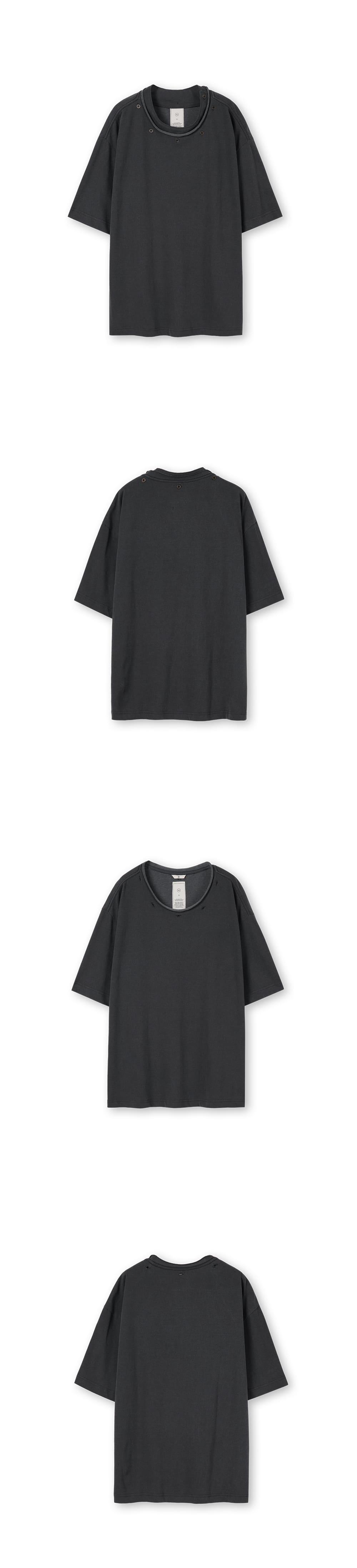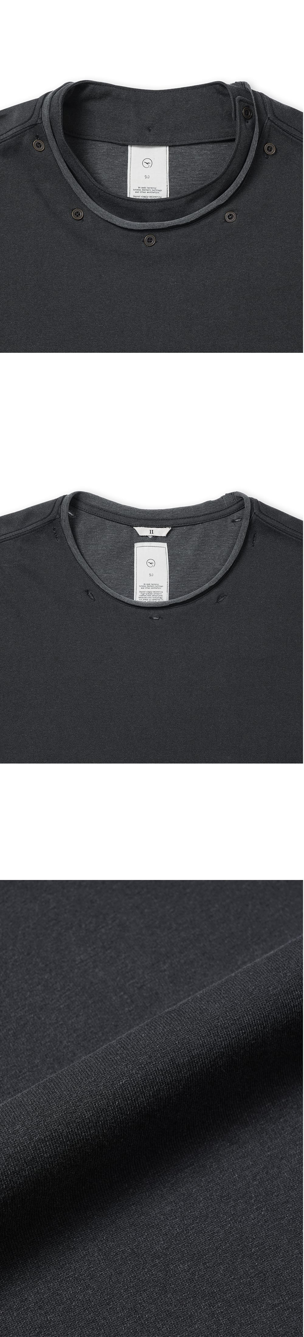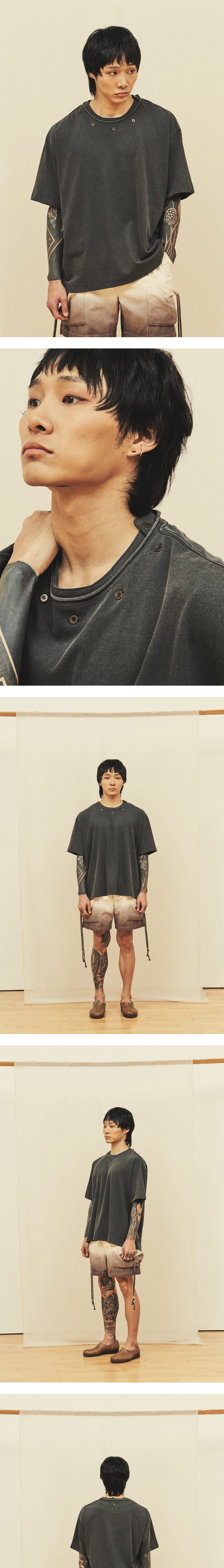 [원단] 구김이 잘 가지 않으며 잦은 세탁에도 견고한 원단을 사용했습니다. 피그먼트 염색되어 내추럴 무드를 더했으며. 대다수의 남성분들이 선호할만한 적당한 두께감으로 데일리로 활용하기 좋습니다. [디테일] 두 가지 넥 라인으로 변형이 가능한 디테처블 티셔츠입니다. 단추를 활용해 립 부분을 탈부착할 수 있도록 디자인해 스타일링 활용도를 높히고자 했습니다. 단추 자체로 디자인 포인트가 되어 단품으로도 충분한 존재감을 발휘합니다. [메이킹] 세탁 후에도 립 부분이 틀어지지 않도록 여러 차례의 테스트를 거쳤습니다. 앤티크한 컬러감의 가볍고 얇은 단추를 사용해 내구성을 높였습니다. * 모델 : 180cm 70kg / III (L) 착용