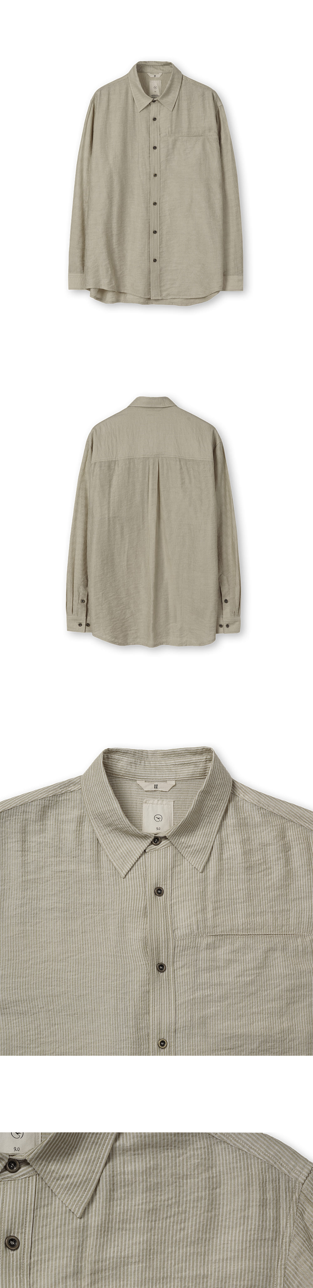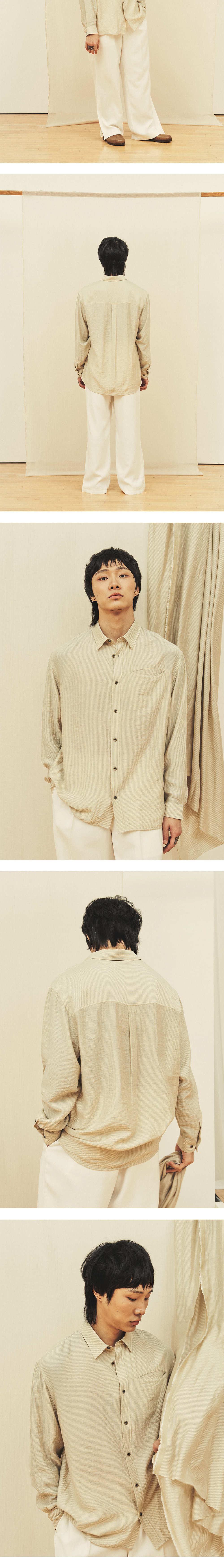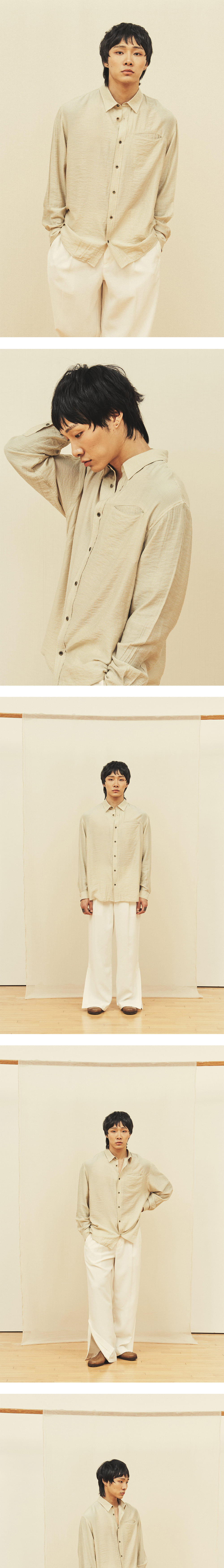[원단] 실키하고 자연스러운 요철감을 가진 셔츠입니다. 얇고 부드러워 젠더리스한 느낌을 가지고 있습니다. 촘촘한 스트라이프로 부담스럽지 않은 스타일링이 가능합니다. [디테일] 체스트 포켓은 자연스럽게 벌어져 원단 특유의 유려한 느낌을 강화합니다. 전체적으로 부드럽게 흐르도록 하기 위해서 심지는 넣지 않았습니다. 가볍지만 금속 텍스처를 가진 단추를 사용해 완성도를 높였습니다. [메이킹] 부드러운 터치감과 요철감을 위해 한 차례 워싱을 진행했습니다. 보다 안정적인 수축률을 보장합니다. * 모델 : 180cm 70kg / III (L) 착용