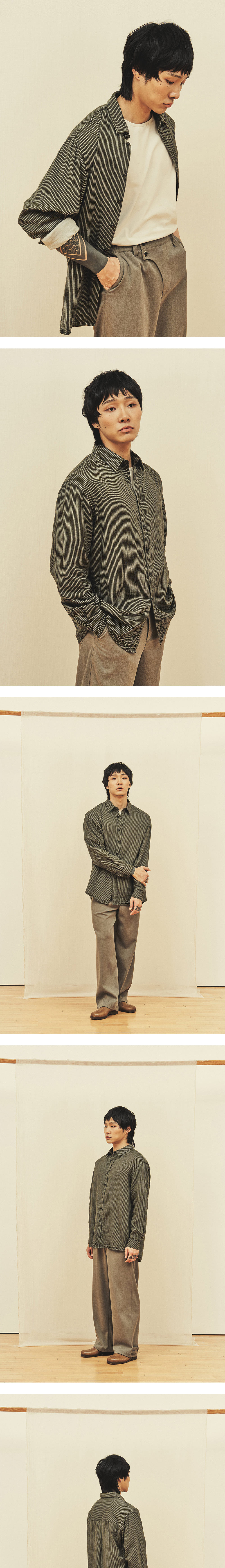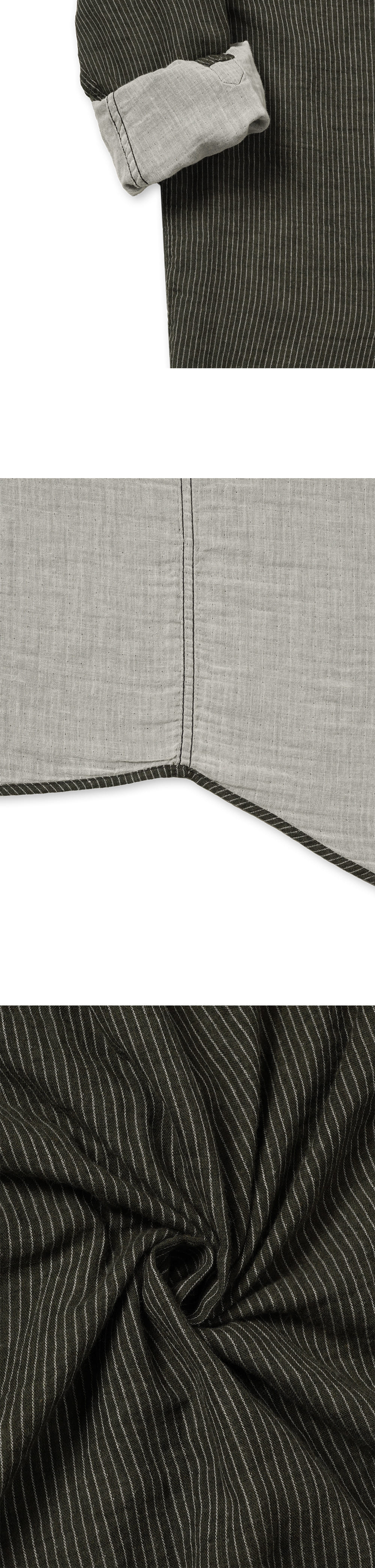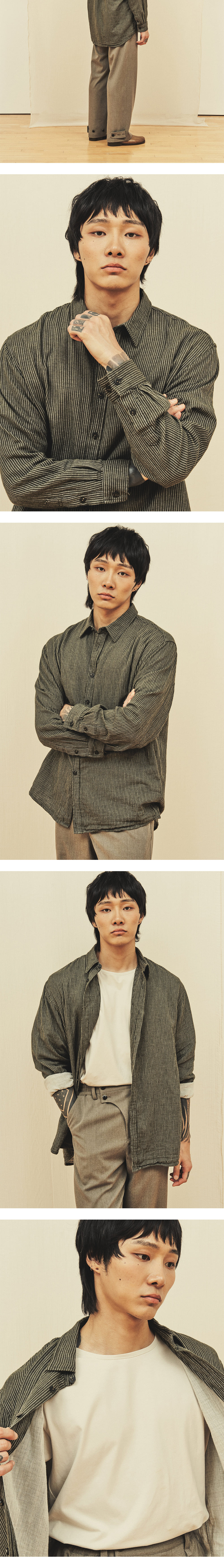 [원단] 부드럽고 가벼운 거즈 원단을 사용했습니다. 이중직 원단으로 적당한 구김과 볼륨감이 특장점입니다. 같은 이유로 안팎의 컬러가 다르며, 표면에는 스트라이프가 있어 밋밋하지 않습니다. 더불어 프린팅된 무늬가 아니라, 실 자체를 염색하여 제직한 무늬이기 때문에 스트라이프가 선명하고 고급스럽습니다. [디테일] 기교를 부리지 않은 릴렉스드한 실루엣을 가지고 있습니다. 매트한 질감의 단추를 사용하여 자연스러운 스타일링이 가능토록 의도했습니다. 단추를 오픈하였을 때 안쪽 면의 이질적인 컬러가 보이지 않도록 원단을 크게 덧대었습니다. [메이킹] 다림질이 필요 없이 구겨지는 것을 신경 쓰지 않고 입을 수 있도록 제작하였습니다. 카라에도 두꺼운 심지를 쓰지 않아 내추럴한 느낌을 연출하기에 좋습니다. 셔켓처럼 단독으로 걸쳐도 우아하고, 레이어드 조화를 꾀해도 좋습니다. 세탁 후에는 전반적인 볼륨감이 더욱 살아납니다. * 모델 : 180cm 70kg / III (L) 착용