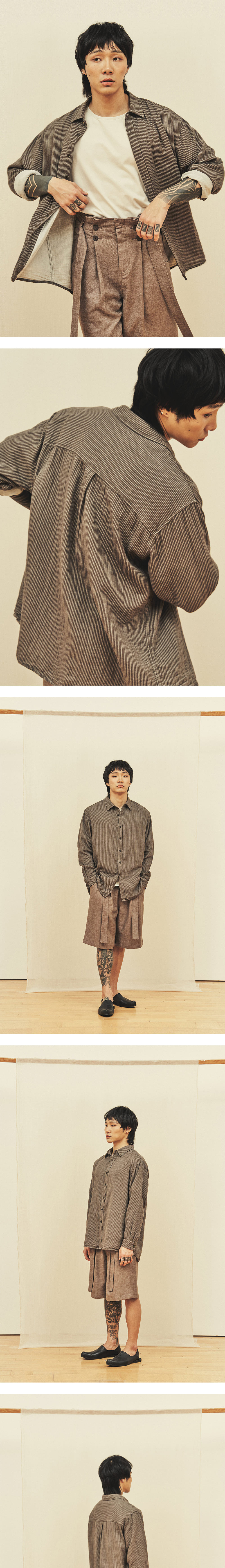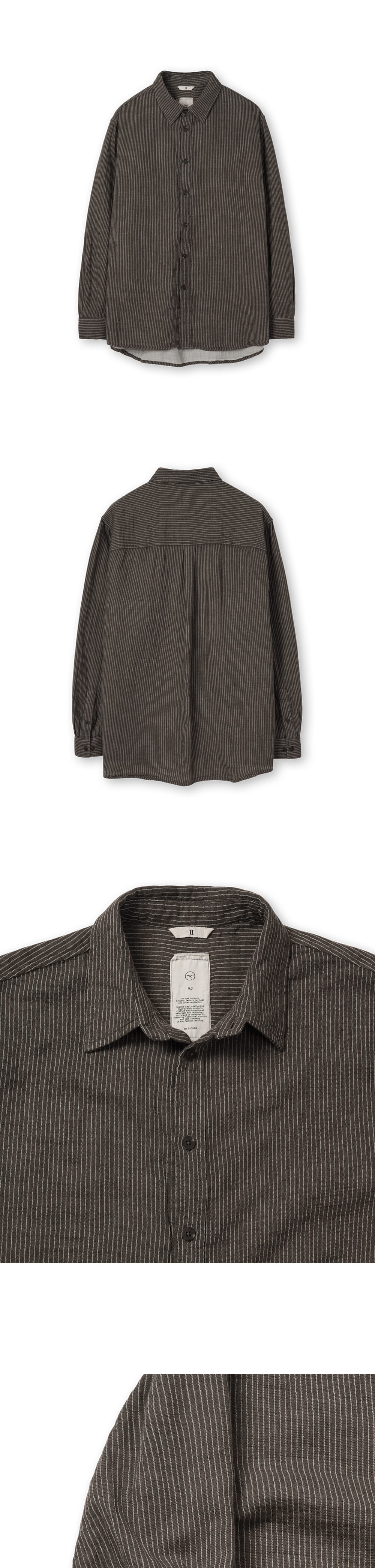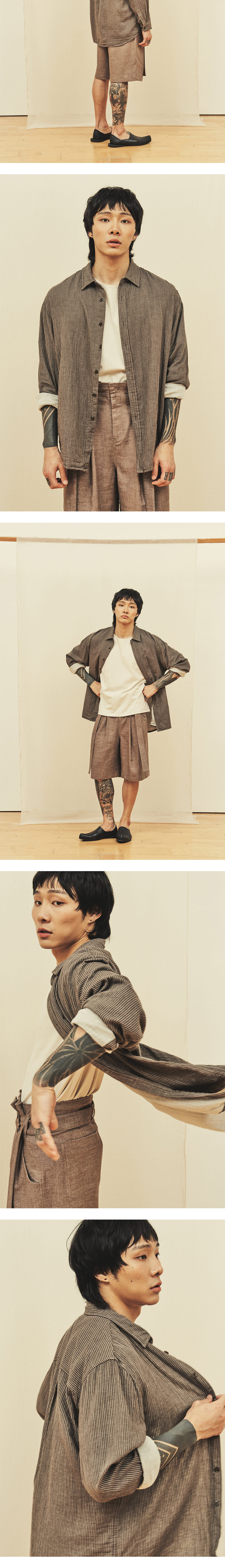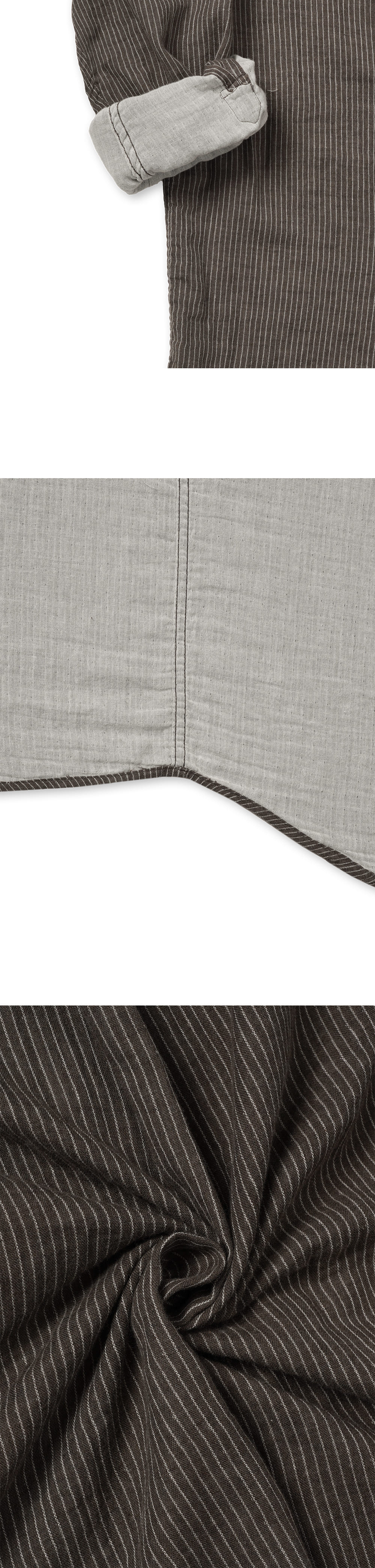[원단] 부드럽고 가벼운 거즈 원단을 사용했습니다. 이중직 원단으로 적당한 구김과 볼륨감이 특장점입니다. 같은 이유로 안팎의 컬러가 다르며, 표면에는 스트라이프가 있어 밋밋하지 않습니다. 더불어 프린팅된 무늬가 아니라, 실 자체를 염색하여 제직한 무늬이기 때문에 스트라이프가 선명하고 고급스럽습니다. [디테일] 기교를 부리지 않은 릴렉스드한 실루엣을 가지고 있습니다. 매트한 질감의 단추를 사용하여 자연스러운 스타일링이 가능토록 의도했습니다. 단추를 오픈하였을 때 안쪽 면의 이질적인 컬러가 보이지 않도록 원단을 크게 덧대었습니다. [메이킹] 다림질이 필요 없이 구겨지는 것을 신경 쓰지 않고 입을 수 있도록 제작하였습니다. 카라에도 두꺼운 심지를 쓰지 않아 내추럴한 느낌을 연출하기에 좋습니다. 셔켓처럼 단독으로 걸쳐도 우아하고, 레이어드 조화를 꾀해도 좋습니다. 세탁 후에는 전반적인 볼륨감이 더욱 살아납니다. * 모델 : 180cm 70kg / III (L) 착용
