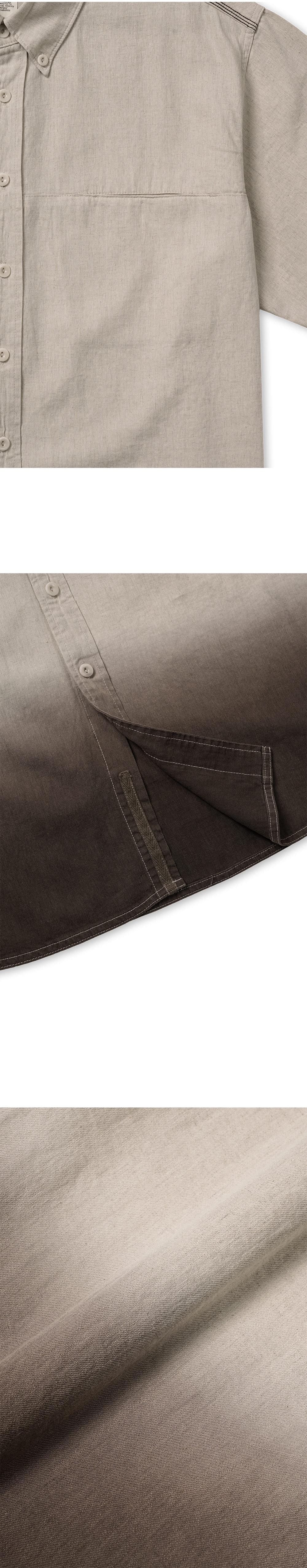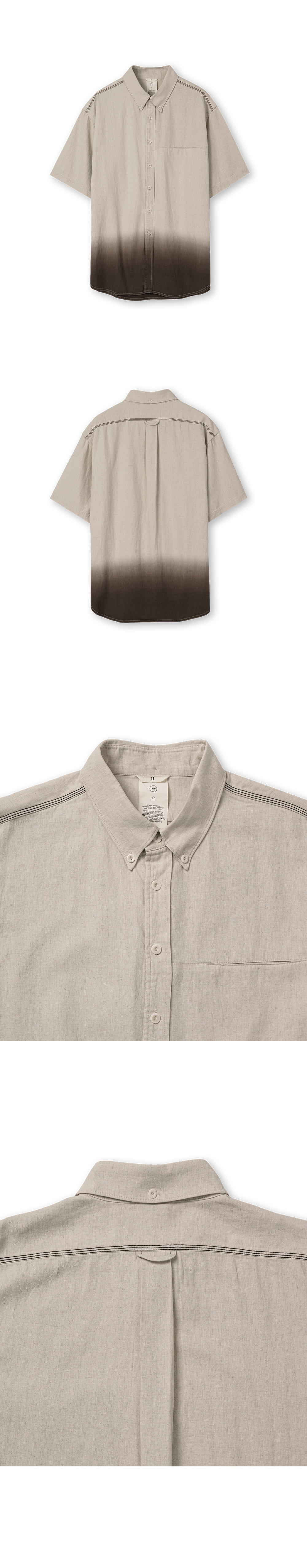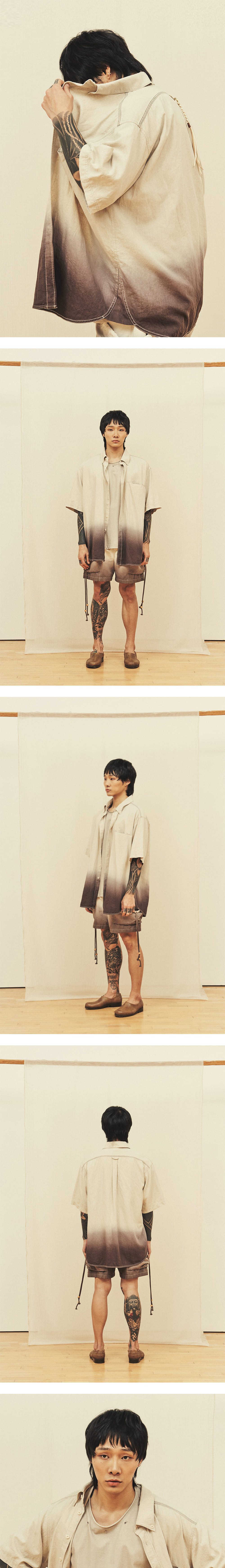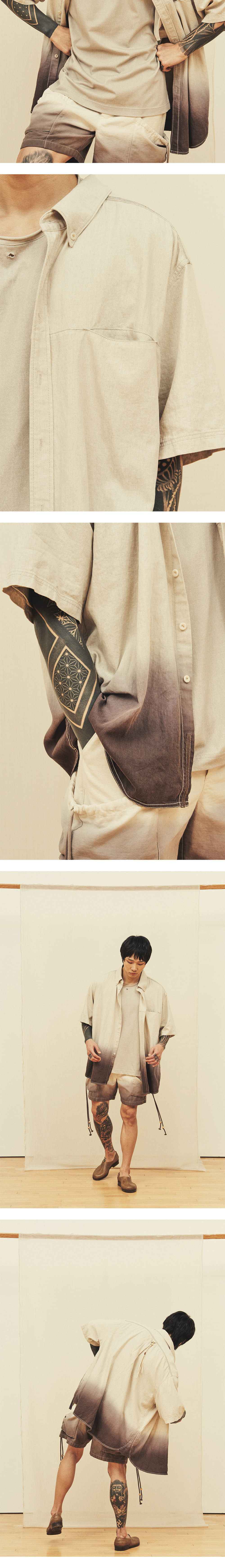 [원단] 천연 소재의 텍스처가 살아 있는 린넨 혼방 원단을 선택했습니다. 은은한 광택감과 적당한 두께감을 가지고 있어 단품 뿐만 아니라, 아우터처럼 가볍게 걸쳐 입기에도 좋습니다. [디테일] 밑단을 둥글게 굴림과 동시에 앞뒤 기장에 차이를 두어 자연스러운 실루엣을 연출했습니다. 굵은 두께의 봉제실을 사용하여 견고함을 더했으며, 어깨와 등 쪽에 배색 스티치를 넣어 완성도를 높였습니다. 또한, 등판 절개 라인을 상단으로 올려 어깨를 감싸는 듯한 독특한 실루엣을 완성했습니다. 카라는 슬림하게 디자인했으며 버튼 다운 스타일을 적용해 전반적인 균형감을 잡았습니다. [메이킹] 브라운과 차콜 컬러 염료를 사용해 그라데이션 다잉을 완성했습니다. 각 개체별로 일일이 염료에 담그는 전통적이면서 고난도의 다잉 기법을 활용해 수묵화 같은 자연스러운 농도 차이를 구현했습니다. * 모델 : 180cm 70kg / III (L) 착용