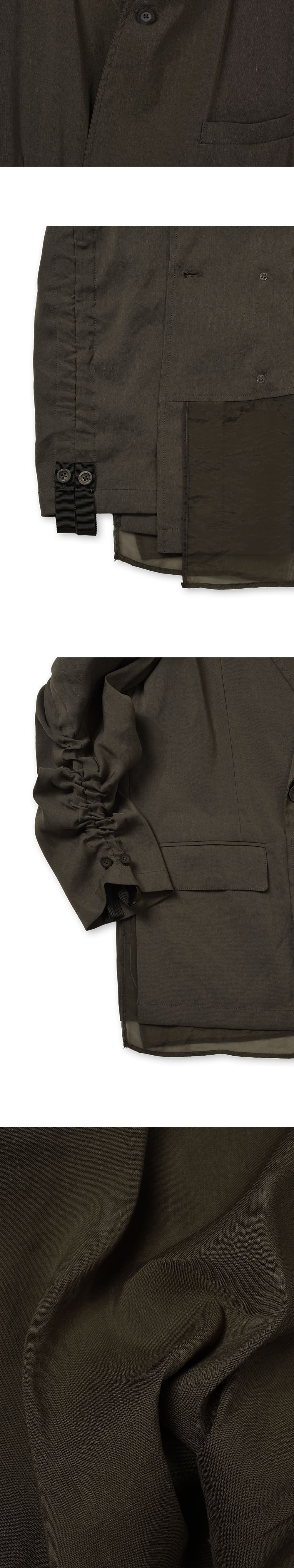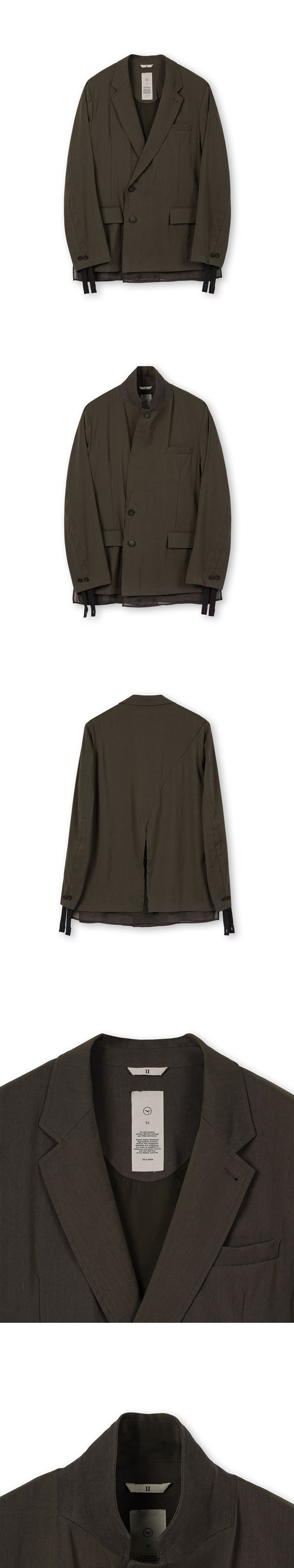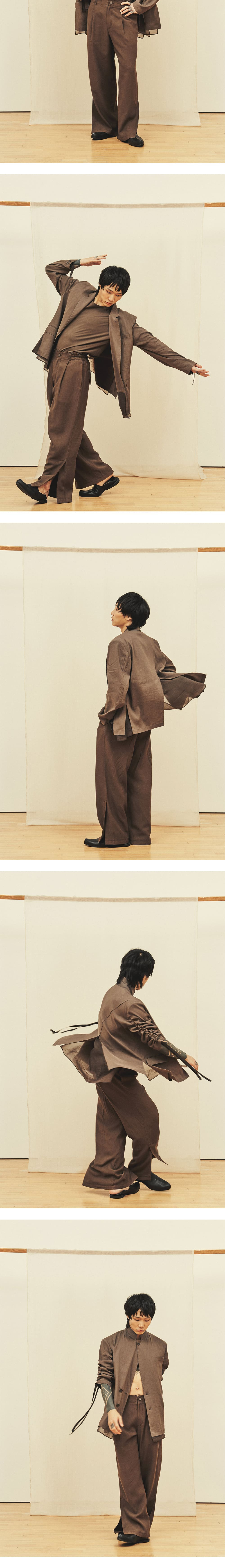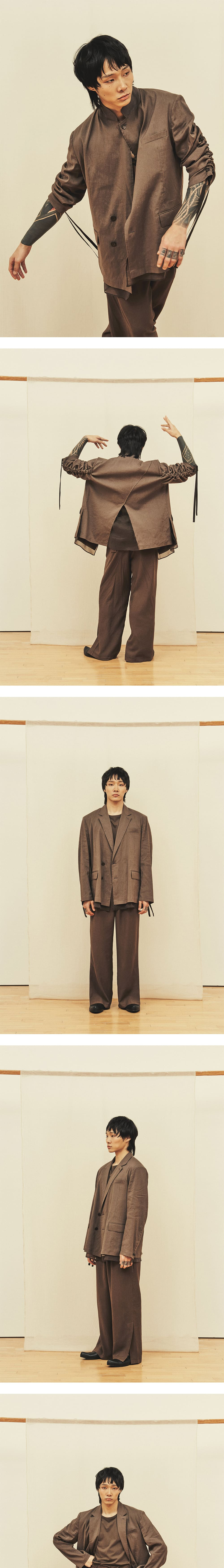 [원단] 은은한 광택과 탄성 있게 흐르는 텍스처가 돋보이는 린넨 혼방 소재입니다. 린넨 특유의 자연스러운 구김이 멋스러우며, 깊이 있는 컬러감이 특징입니다. [디테일] 앞뒤 단차와 뒷트임 디테일을 강조하기 위해 오간자 소재를 안감으로 사용했습니다. 움직임에 따라 우아하게 흩날리며 유려한 실루엣을 연출합니다. 소매를 따라 긴 스트링을 더해 길이 조절이 가능하며, 자연스럽게 잡히는 셔링이 포인트입니다. [메이킹] 카라를 세워 착용할 때를 고려해 더블과 싱글의 중간 형태로 여밈을 디자인했으며, 카라 밑에는 배색 원단을 덧대어 디테일을 더했습니다. 글리터가 섬세하게 들어간 각인 단추를 사용해 완성도를 높였습니다. * 모델 : 180cm 70kg / III (L) 착용