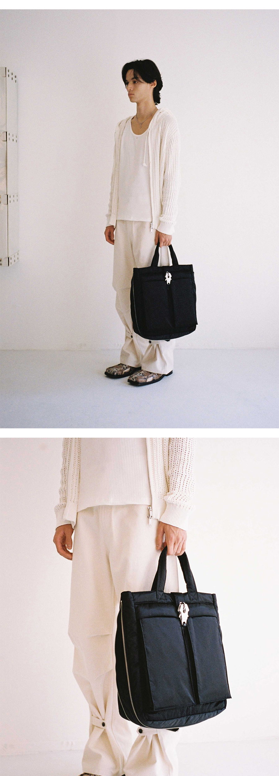 • 안감 배색 포인트 • 클래식한 헬멧 백 형태를 재해석한 토트백 디자인 • 측면의 지퍼를 활용하여 가방 폭을 확장할 수 있는 디자인 포인트 • 그립감이 좋은 로고 각인 지퍼 풀러 • 탈부착 가능한 멜빵 스트랩으로 토트백 및 숄더백으로 투웨이 활용 가능 • 멜빵 스트랩 길이 조절 가능 • 외부 프론트 솔리드 형태의 투 포켓, 백사이드 지퍼로 넉넉한 수납공간 • 넉넉한 내부 수납공간 및 노트북 전용 완충 수납 포켓