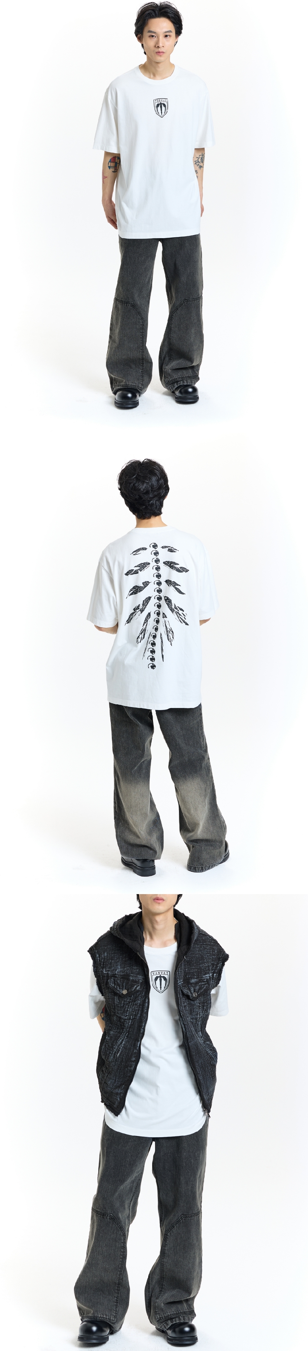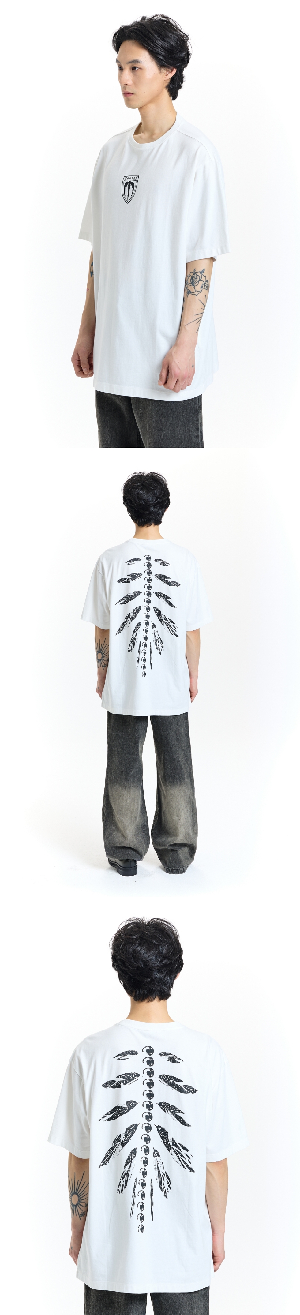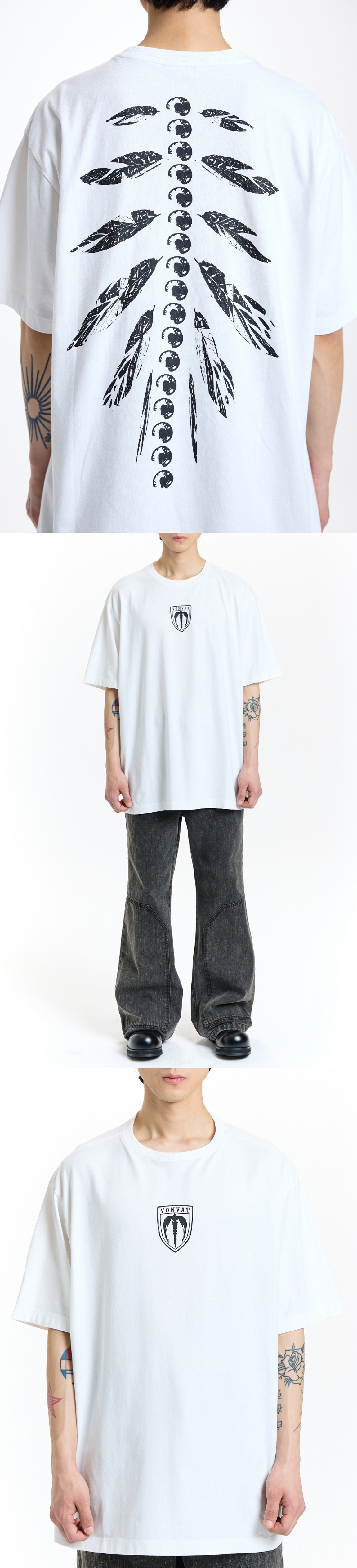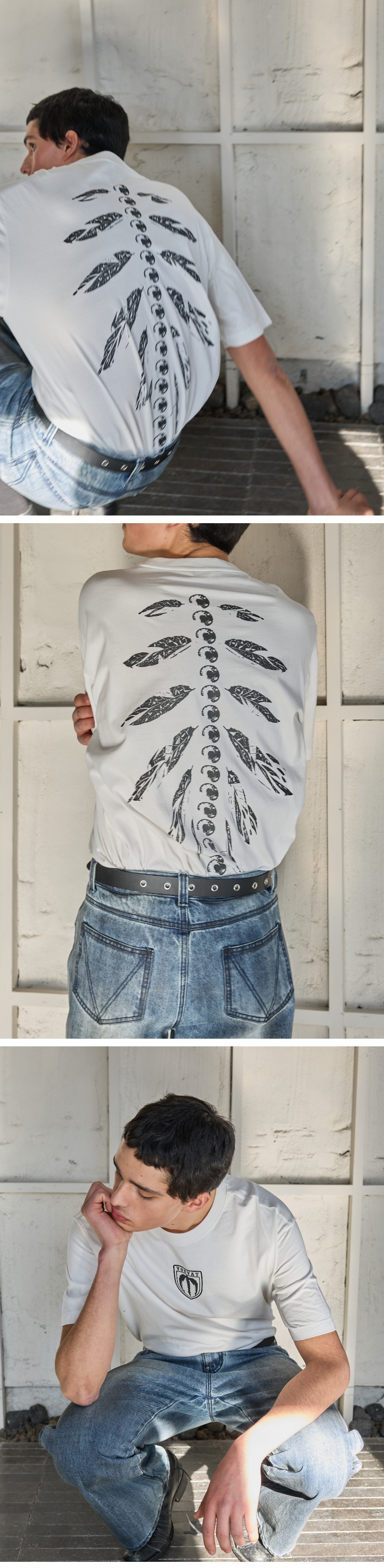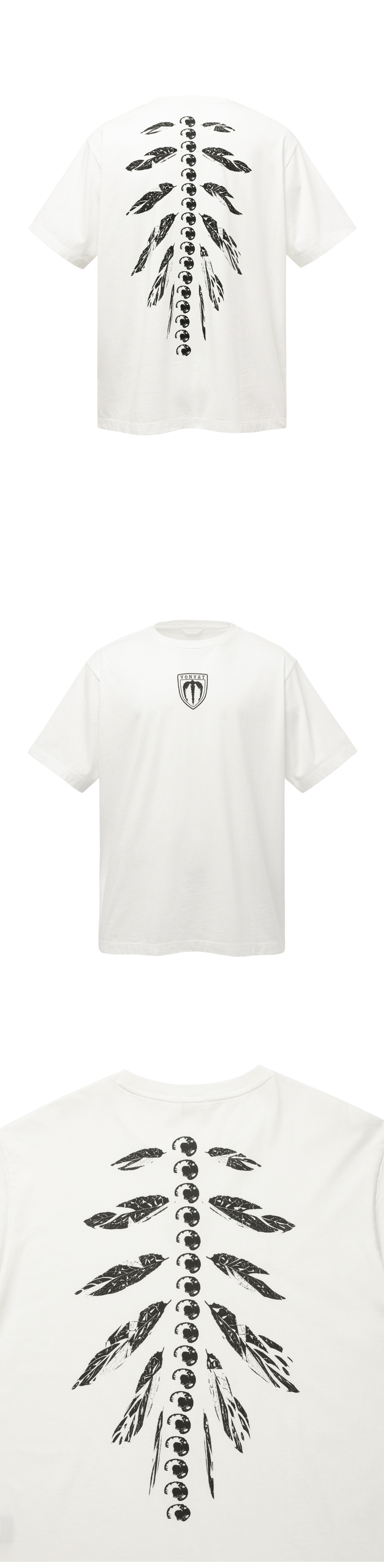 빈티지한 톤온톤 그래픽의 세미오버핏 반팔 티셔츠 메인 원단은 바이오 워싱을 여러 차례 돌려서 부담스럽지 않은 빈티지 느낌을 구현 앞판에는 방패모양에서 착안 본바트 로고가 들어간 그래픽이 중앙에 배치되어서 남성적인 느낌을 표현 등판에는 실제 낙엽의 아웃라인을 따서 만든 척추 형태의 그래픽을 실리콘 프린팅을 통해서 표현 적당한 두께감의 20수 싱글 원단으로 제작 Shell : Cotton 100% 세미 오버핏 1(S) : 총장 69, 어깨단면 49.5, 가슴단면 58.5, 소매길이 22.5, 밑단단면 55 2(M) : 총장 71, 어깨단면 51.5, 가슴단면 61, 소매길이 23.5, 밑단단면 57.5 3(L) : 총장 73, 어깨단면 53.5, 가슴단면 63.5, 소매길이 24.5, 밑단단면 60