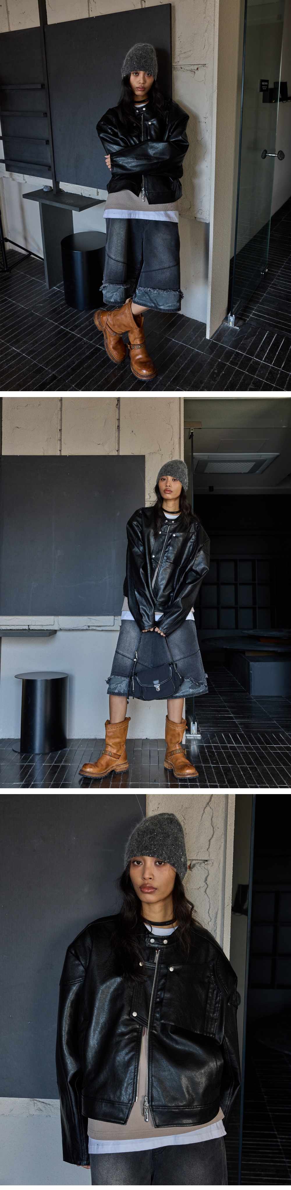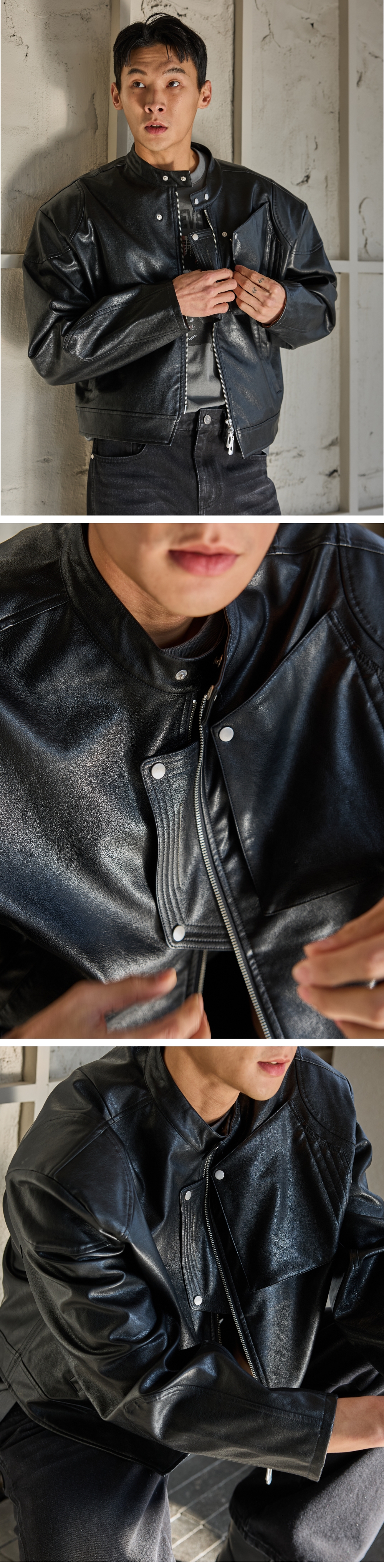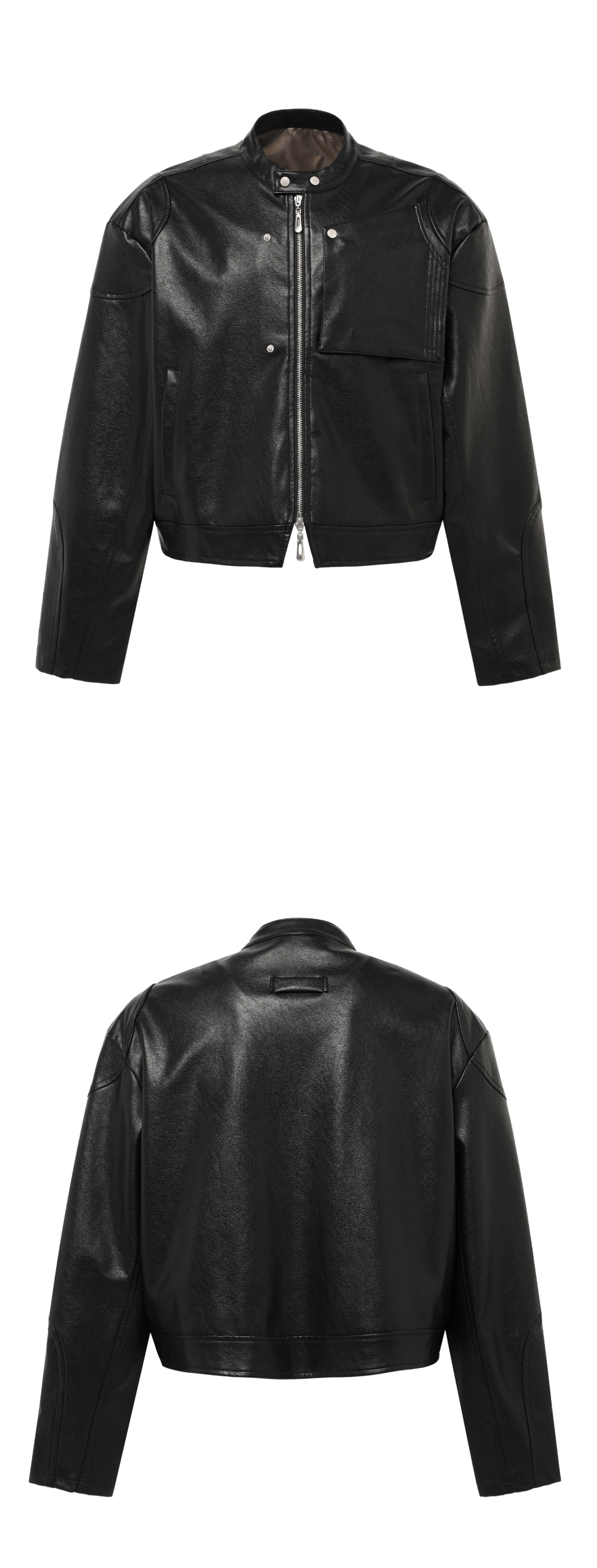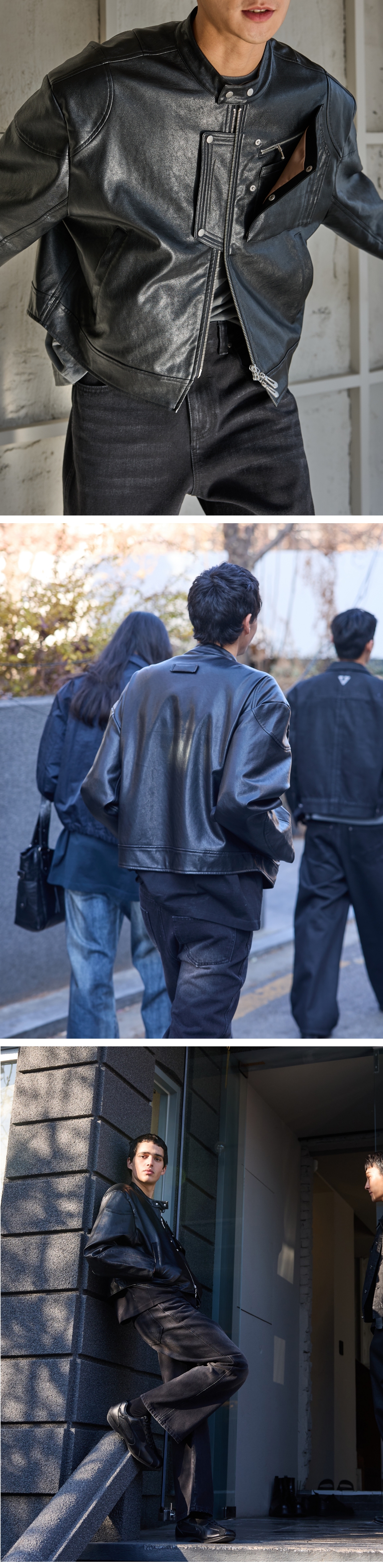 - 페이크 레더로 제작된 남성적인 바이커자켓 - 몸판쪽 부속 포켓 내 지퍼포켓 수납 - 크롭오버핏으로 실제 라이더시 착용하는 자켓을 모티브 디자인 - 브라운톤의 고밀도 안감 사용 Shell : Cotton 55%, PU 45% Caution : 프론트 포켓은 섬세한 디테일로 제작되어 있어 갑작스러운 힘이 가해지면 손상 될 가능성 有 크롭 오버핏 1(S) : 총장 57, 어깨단면 56.5, 가슴단면 63.5, 소매길이 60.5, 밑단단면 53 2(M) : 총장 59, 어깨단면 58.5, 가슴단면 66, 소매길이 62, 밑단단면 55.5 3(L) : 총장 61, 어깨단면 60.5, 가슴단면 68.5, 소매길이 63.5, 밑단단면 58