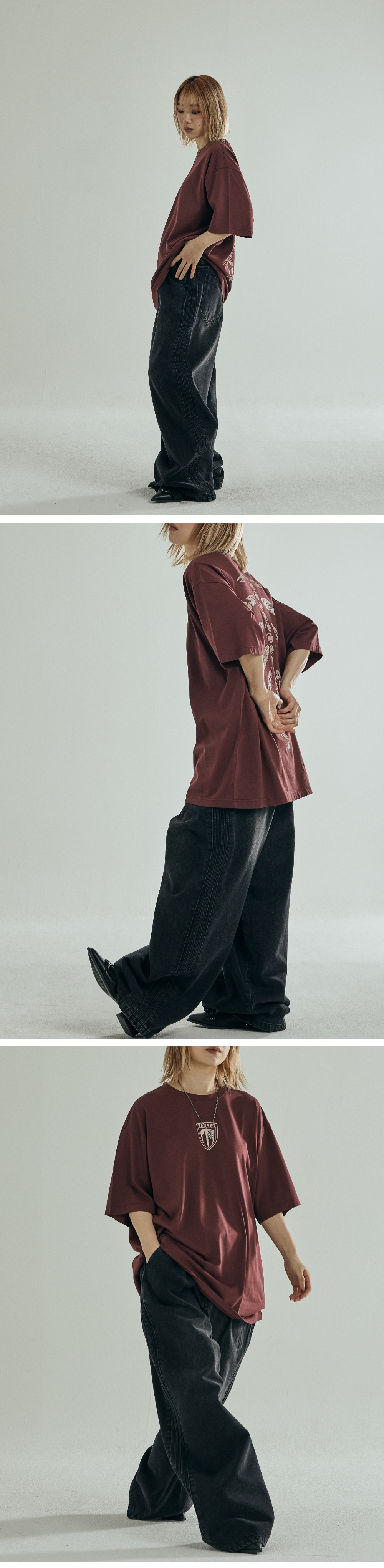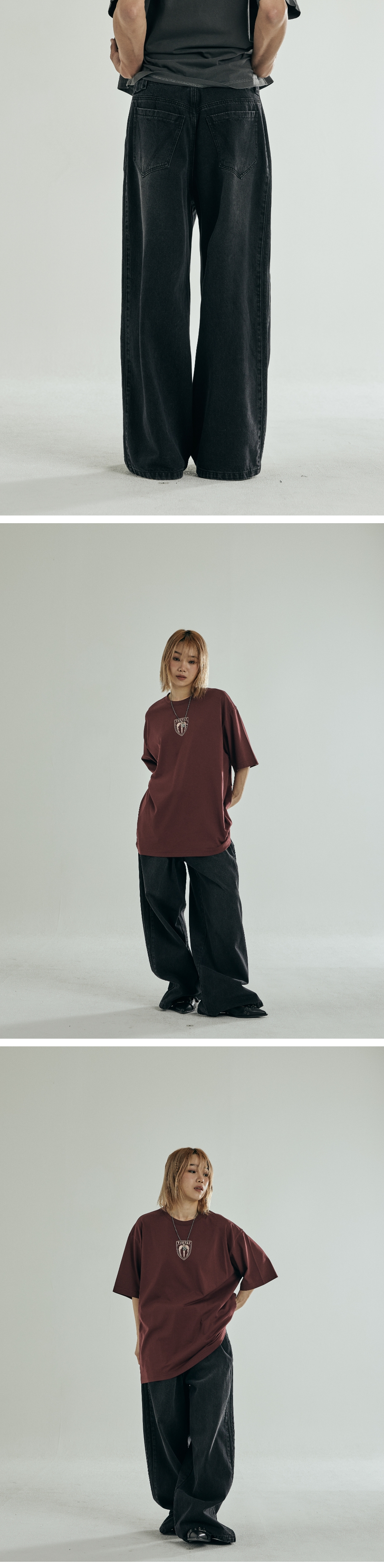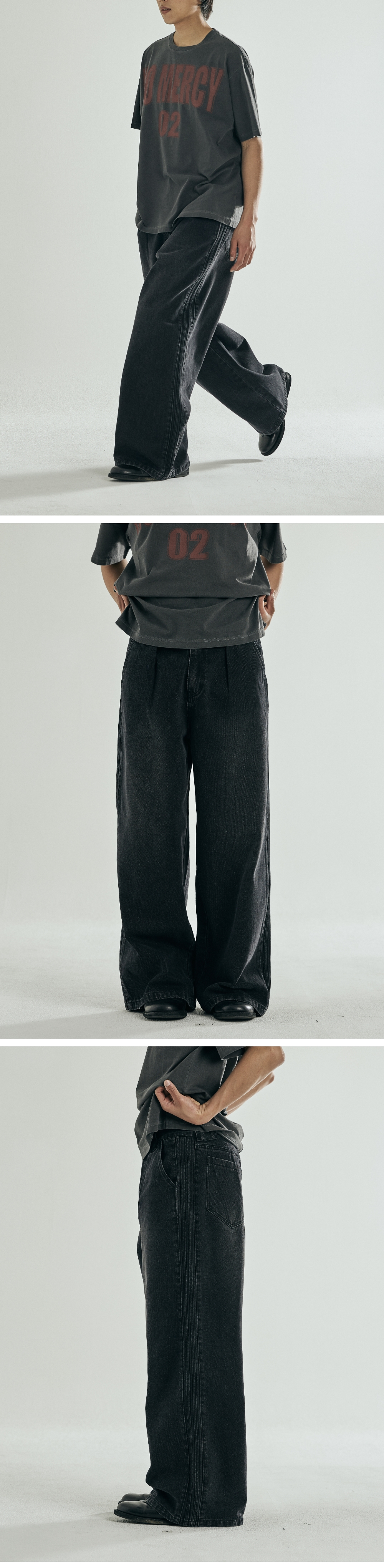 사이드 라인 트랙 디테일 넓게 일자로 떨어지는 오버핏 실루엣 YKK 금속 뎅고 지퍼 사용 Shell : 면 66% 폴리우레탄 22% 레이온 12% 오버핏 1(S) : 총장 103.5, 허리둘레 38, 허벅지단면 36, 밑위길이 34.2, 밑단단면 30 2(M) : 총장 105.5, 허리둘레 40.5, 허벅지단면 37.5, 밑위길이 35, 밑단단면 31 3(L) : 총장 107.5, 허리둘레 43, 허벅지단면 39, 밑위길이 35.8, 밑단단면 32
