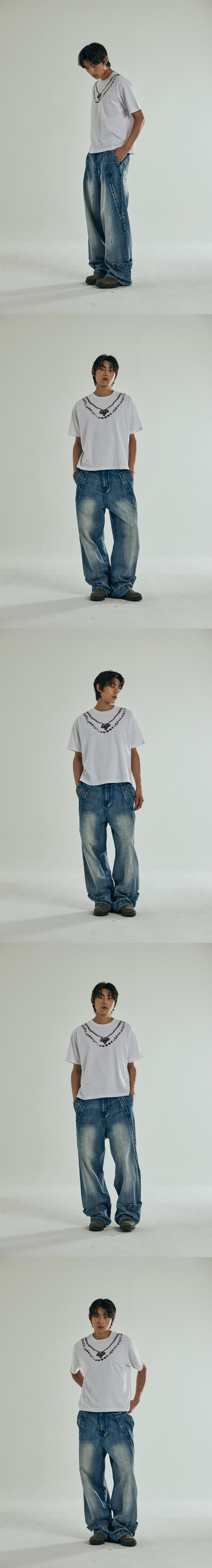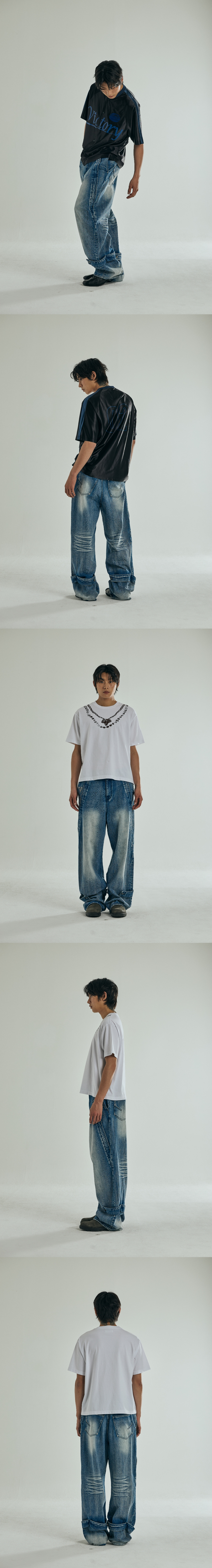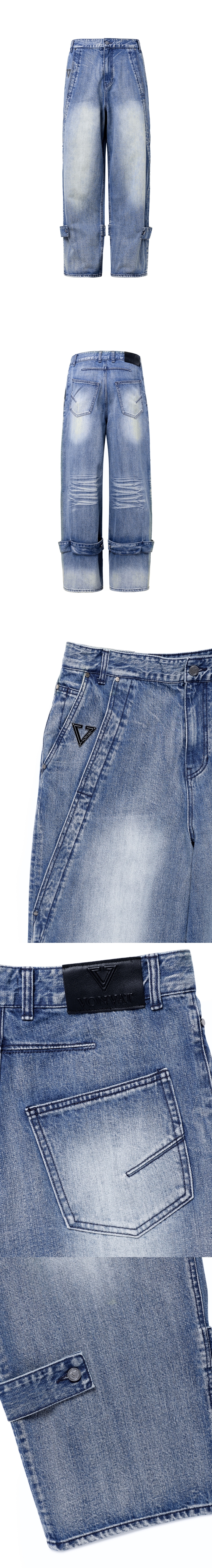 매트하고 견고한 데님원단으로 제작된 리얼 와이드 데님 트라우저 스톤 워싱 후 브러쉬 및 캣 워싱 포인트로 한층 더 입체감을 살려 차별화 팬츠의 앞면에는 사선 포켓에 대칭된 플래쉬 및 하단 비죠 디테일로 해체주의적 디자인을 가미하여 빈티지한 무드로 연출 전체적으로 직접 개발된 금속 부자재 및 리얼레더 와펜을 사용 본바트 금속 와펜 장식, 뒤면에는 시그니처 다트 작업 YKK사의 금속 지퍼를 사용 Shell : Cotton 100% 1(46) : 총장 110, 허리단면 40, 허벅지단면 36, 밑위 38.5, 밑단단면 26.5 2(48) : 총장 112, 허리단면 42.5, 허벅지단면 37.4, 밑위 39.3, 밑단단면 27 3(50) : 총장 114, 허리단면 45, 허벅지단면 38.8, 밑위 40.1, 밑단단면 27.5