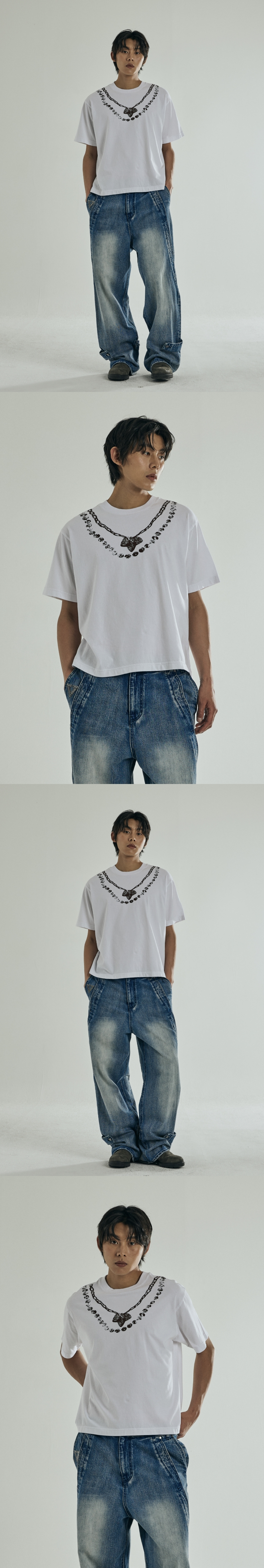 부드러운 터치감의 20수 원단으로 제작 짧은 총장과 넓은 가슴폭으로 제작되어 독자적인 실루엣 연출 헤비 바이오 워싱 작업 유니크한 넥라인 목걸이 포인트 그래픽 작업 Shell : 코튼 100% 1(S) : 총장 61, 어깨 49 가슴단면 57, 소매길이 20.5, 밑단단면 57.5 2(M) : 총장 63, 어깨 51 가슴단면 59.5, 소매길이 22, 밑단단면 60 3(L) : 총장 65, 어깨 53 가슴단면 62, 소매길이 23.5, 밑단단면 62.5 모델1(남) 184cm / 상의 3사이즈 / 하의 2사이즈 모델2(남) 182cm / 상의 3사이즈 / 하의 2사이즈