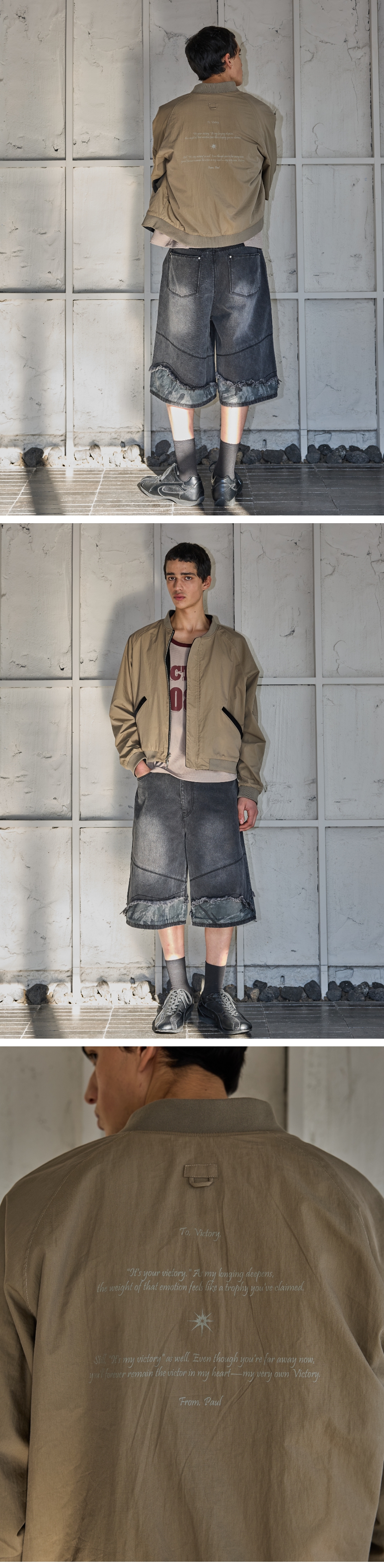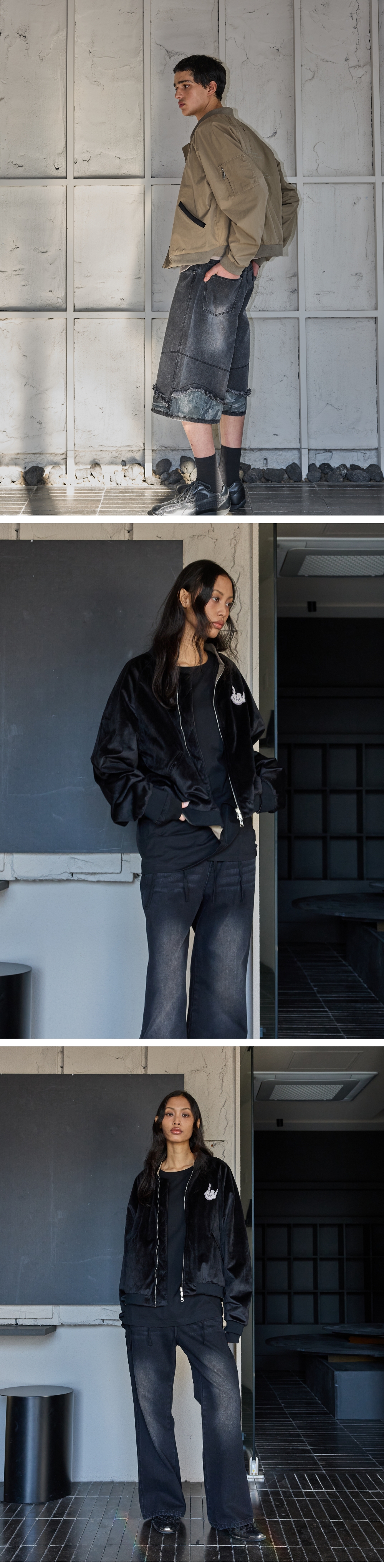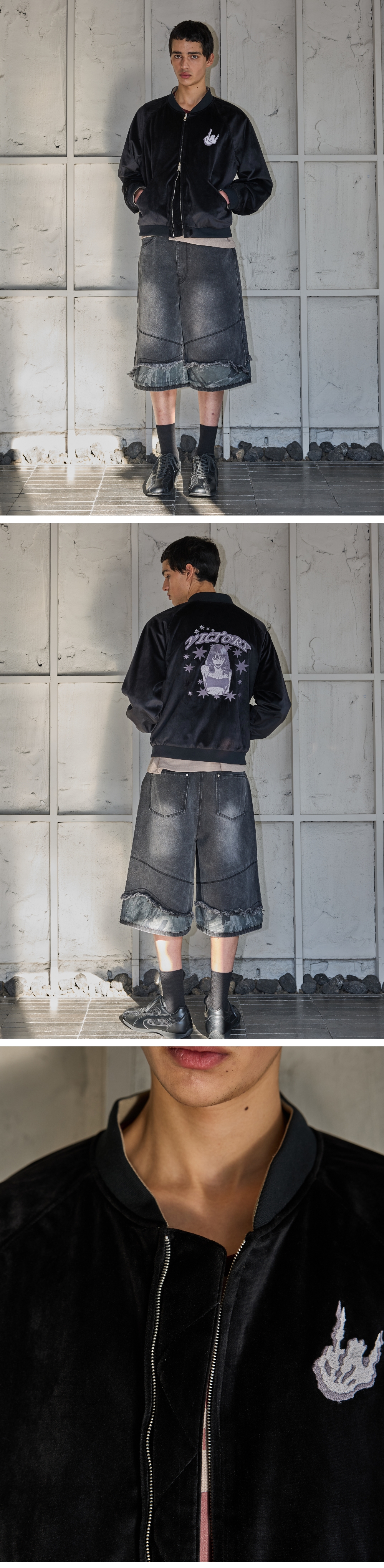 - 벨벳원단 및 프린팅된 안쪽면으로 이루어진 리버시블 블루종 - 부드러운 터치감의 벨벳원단 사용 - 내부 배색면은 그레이쉬한 베이지컬러의 원단에 톤온톤 레터링 그래픽 작업 - 벨벳원단에는 등판 그래픽 자수작업 - 안감이 없어서 한여름 제외하고 착용가능 Shell : Cotton 65% Nylon 35% Lining : Poly 100% Caution : 벨벳 소재 특성상 물 빨래시 원단이 거칠어질 수 있습니다. 1(S) : 총장 59, 가슴단면 63.5, 화장 82, 밑단단면 47 2(M) : 총장 61, 가슴단면 66, 화장 83.5, 밑단단면 49.5 3(L) : 총장 63, 가슴단면 63.5, 화장 85, 밑단단면 52