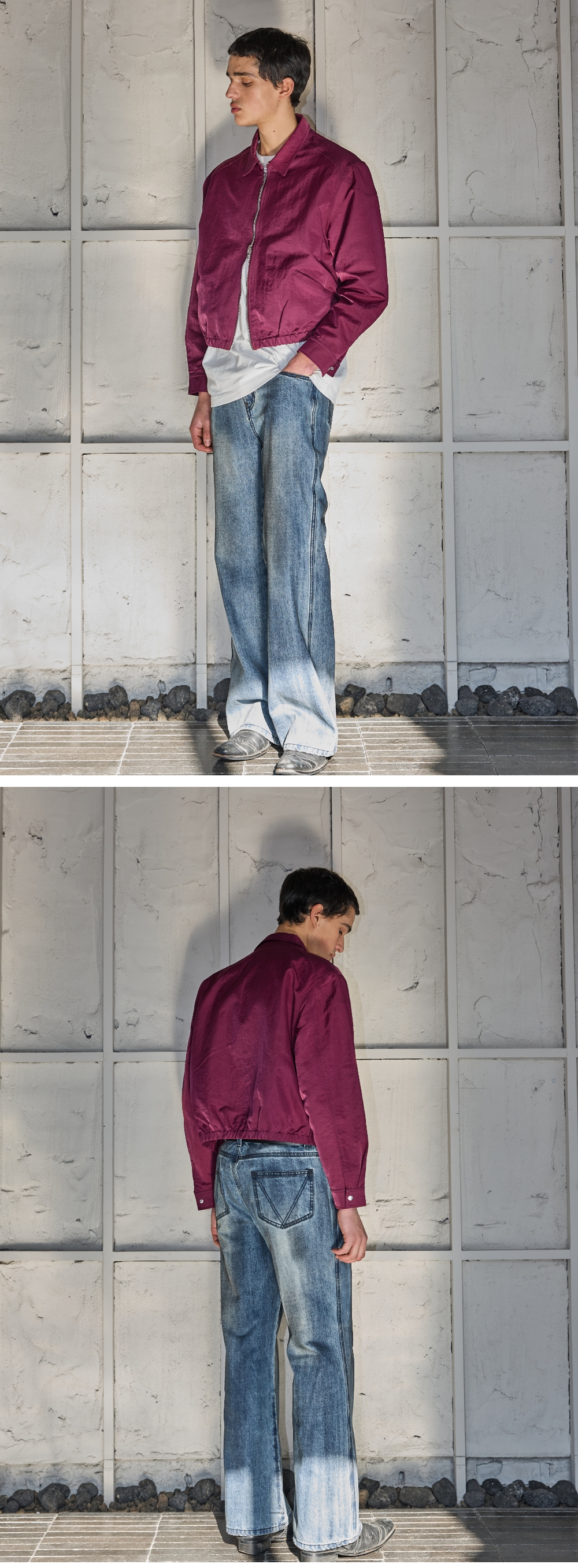 - 은은한 광택감의 나일론원단의 셔츠형 아우터 - 어깨패드가 들어가서 남성적인 실루엣 연출 - 밑단은 1인치 폭의 E-band 밴딩처리 - 안감이 없어서 한여름 제외하고 착용가능 Shell : Nylon 100% Caution : 안감쪽 어깨 패드부분은 갑작스러운 힘이 가해지면 손상 될 가능성 有 크롭 오버핏 2(M) : 총장 60, 어깨단면 55, 가슴단면 67.5, 소매길이 63, 밑단단면 50 3(L) : 총장 62, 어깨단면 57, 가슴단면 70, 소매길이 64.5, 밑단단면 52.5