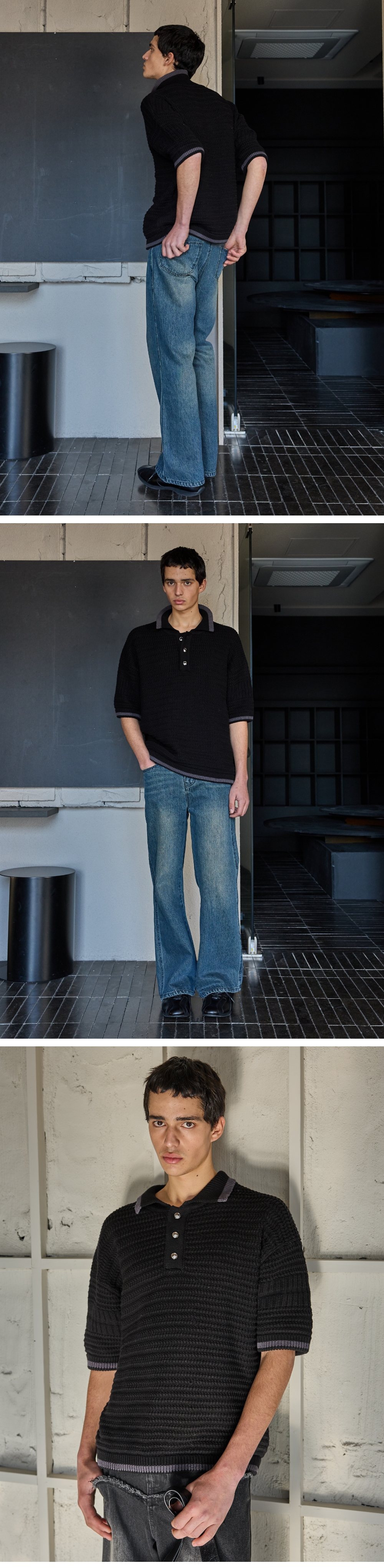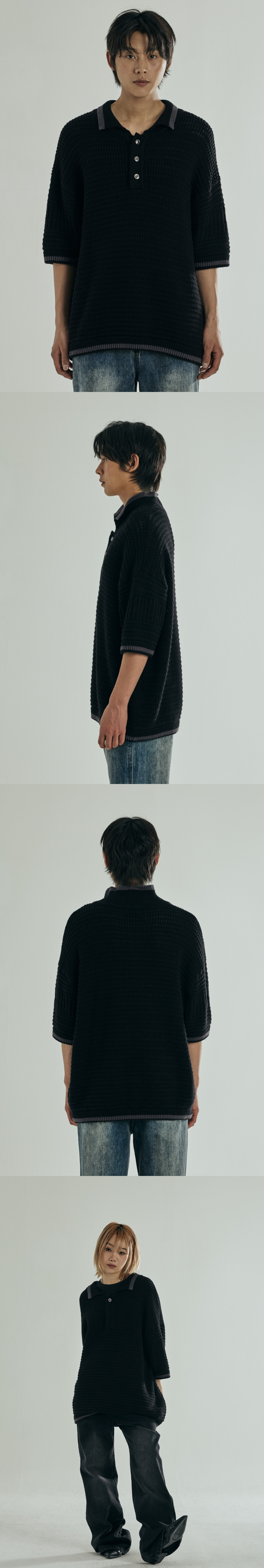 카라넥, 밑단, 소매에 배색 컬러 디테일 고급스러운 메탈 버튼 포인트 니트만이 가지고 있는 무게감으로 독보적인 루즈핏 연출 여름 착용을 고려하여 굵직하지만 넓은 짜임으로 제작 Shell : 코튼 100% 오버핏 1(S) : 총장 65.5, 어깨 58, 가슴단면 55, 소매길이 22.5, 밑단단면 45 2(M) : 총장 67.5, 어깨 59.5, 가슴단면 59, 소매길이 23.5, 밑단단면 49 3(L) : 총장 69.5, 어깨 61, 가슴단면 63, 소매길이 24.5, 밑단단면 53 모델1(남) 184cm / 상의 3사이즈 / 하의 2사이즈 모델2(남) 182cm / 상의 3사이즈 / 하의 2사이즈 모델3(여) 175cm / 상의 3사이즈 / 하의 2사이즈