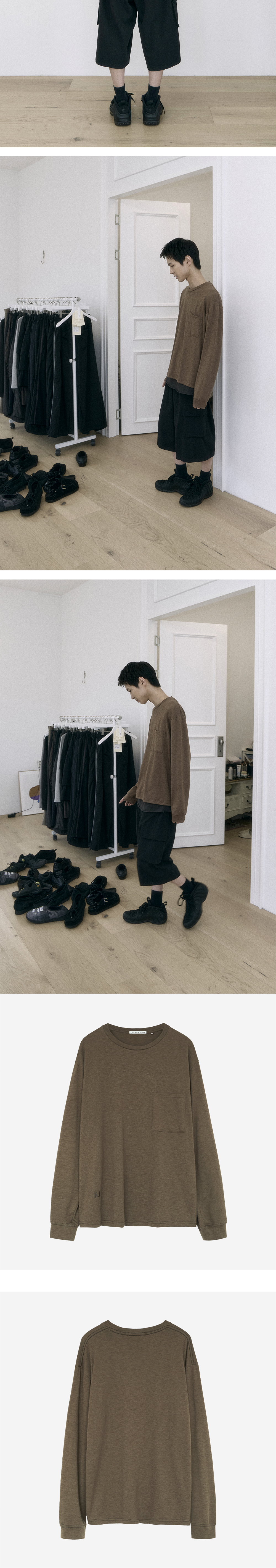 human pocket long sleeve - 슬러비한 텍스쳐의 포켓 롱슬리브 - 가먼트 워시 및 다잉 - 부드러운 촉감 - 드레이퍼리한 물성 - 단품 착용 기준, 휴먼 슬리브리스 및 이너티셔츠와의 매칭을 염두에 둔 패턴입니다.