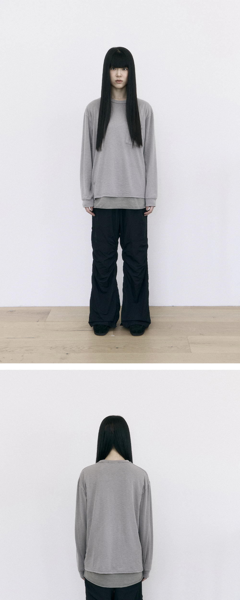 human pocket long sleeve - 슬러비한 텍스쳐의 포켓 롱슬리브 - 가먼트 워시 및 다잉 - 부드러운 촉감 - 드레이퍼리한 물성 - 단품 착용 기준, 휴먼 슬리브리스 및 이너티셔츠와의 매칭을 염두에 둔 패턴입니다. *여성모델: 170 초반, 마른 체형 / 3사이즈 착용 *남성모델: 180 초반, 마른 체형 / 3사이즈 착용 *일반 체형 기준 - 160cm 중반 1사이즈 권장 - 170cm 초반 2사이즈 권장 - 170cm 중반 3사이즈 권장 - 170cm 후반~180cm 초반 4사이즈 권장