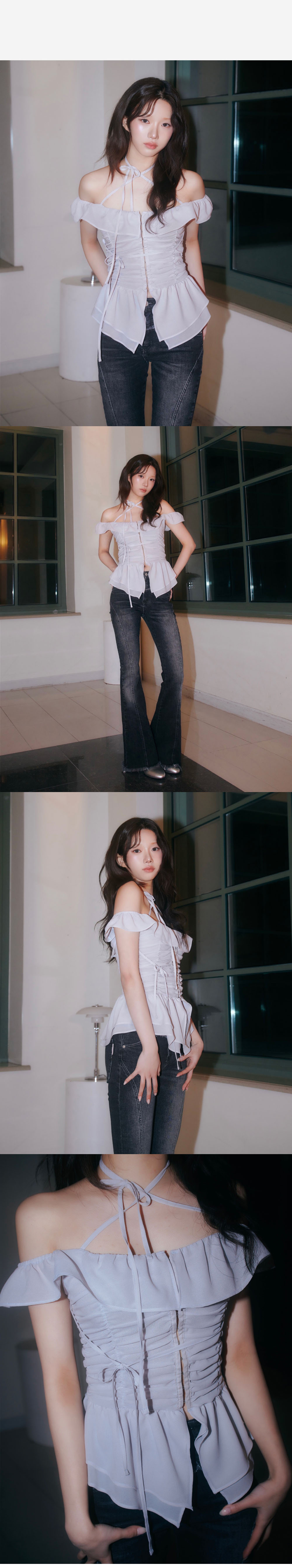 쉬폰 소재의 후크 블라우스 입니다. 어깨 끈으로 여러가지 연출이 가능하며 다양한 무드로 착용이 가능한 블라우스 입니다.