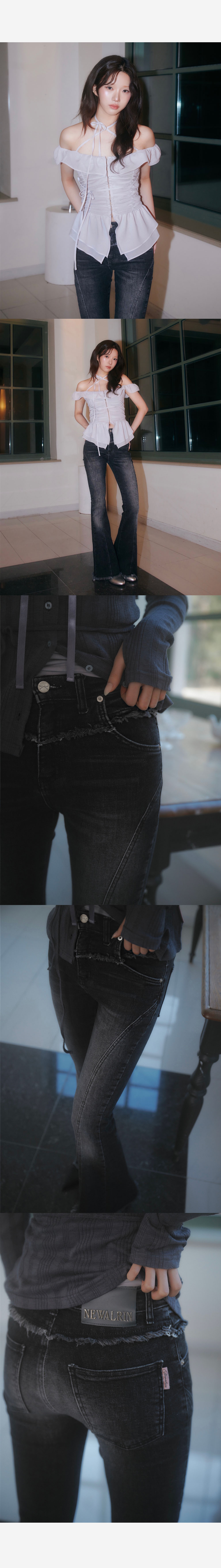 뉴얼린의 새로운 데님 라인 제품입니다. 부츠컷, 새미 하이웨이스트로 다리가 슬림해 보이는 핏으로 데일리하게 착용하기 좋은 데님입니다.