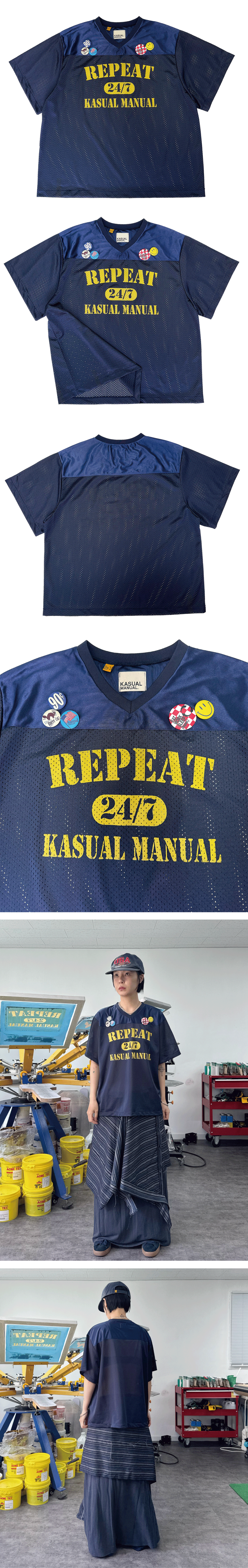 Eat, Work, Sleep, Repeat. 우리의 일상이 곧 스타일이 된다. Kasual Manual의 시그니처 문구를 가슴에 담은 메시 저지. 반복되는 일상 속에서 당신만의 루틴을 지켜내는 사람들을 위한 유니폼. 통기성이 뛰어난 메시 소재로 제작되어 여름철에도 가볍고 쾌적하게 착용할 수 있습니다. ‘REPEAT 24/7’ 프린트와 빈티지 무드의 뱃지 장식은, 일과 휴식의 경계를 넘나드는 Kasual Manual만의 철학을 표현합니다. 단독 착용은 물론, 이너웨어와 레이어드해도 멋스러운 아이템. 평범한 하루도 당신만의 스타일로 채워보세요.