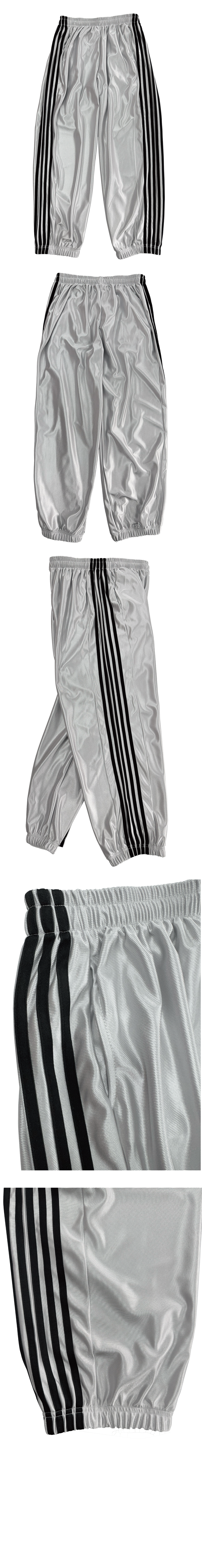 •택감 있는 실버 컬러 폴리 소재 사용 •옆선 블랙 테이프 디테일로 유니크한 포인트 •허리 및 발목 밴딩으로 활동성 강화 •루즈핏 실루엣으로 스트리트 무드 강조