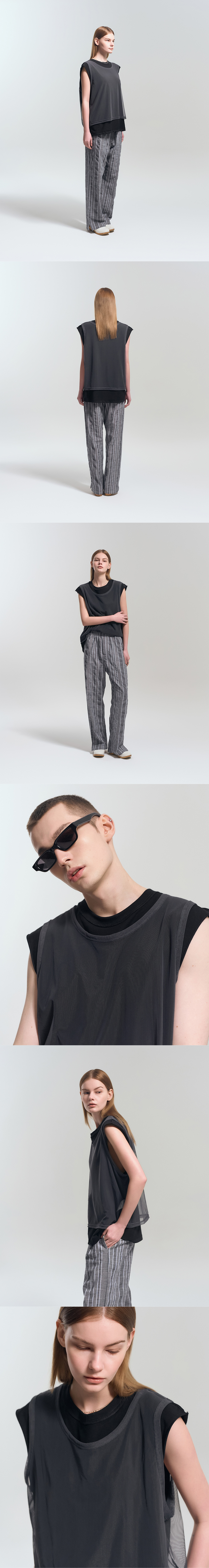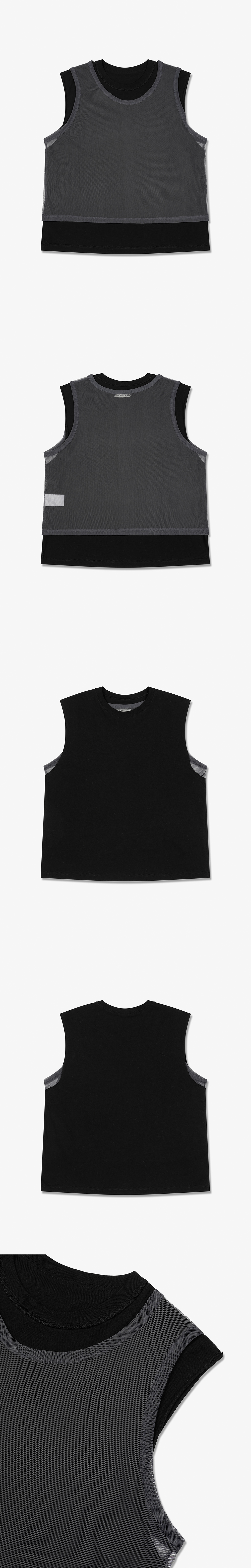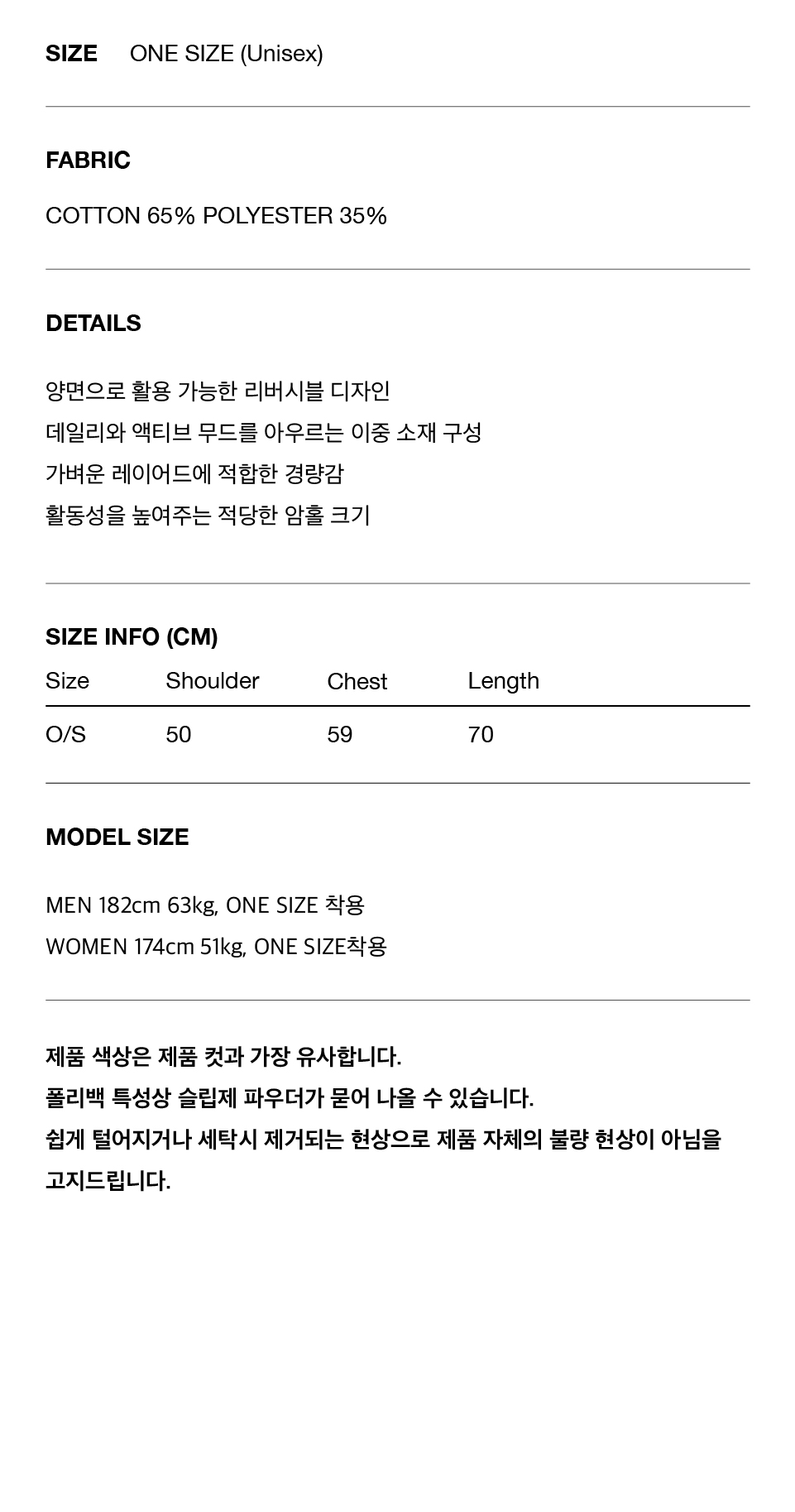 양면으로 착용 가능한 리버시블 디자인의 슬리브리스입니다. 한쪽은 면, 반대쪽은 메쉬 소재로 구성되어 데일리한 스타일링부터 액티브한 무드까지 유연하게 활용 가능합니다. 가볍고 부담 없는 레이어드에 적당한 암홀 크기로 활동성까지 고려한 실용적인 아이템입니다.