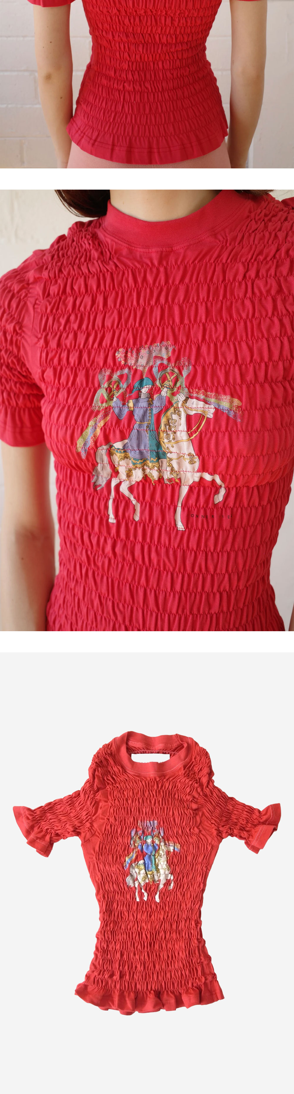 단품 착용으로도 포인트가 되는 코너 아이브스 우먼 레드 카멜롯 쉬어드 티셔츠 레드입니다. - 영국 전역에서 공수한 빈티지 반팔 축구 유니폼을 ci 스튜디오 팀이 직접 엄선하여 제작 - 유니폼을 분해한 후 신축성 있는 실로 봉제하여 셔링을 잡음 - 전면에 실크스크린 프린트로 장식된 카멜롯 라이더 - 각 제품은 1/1 상품이며, 동일한 복제품으로 재입고되지 않습니다. * 아래 상세 사이즈의 가슴단면: Armpit-to Armpit, fully stretched / Length: Center Front 기장입니다. 구매 시 참고 부탁드립니다.