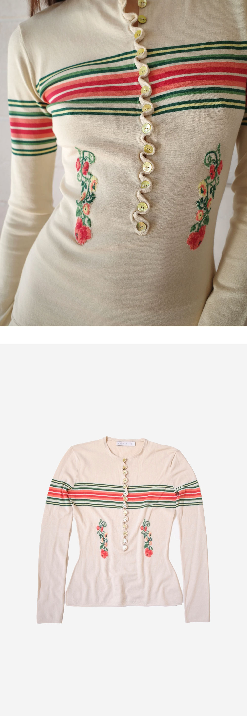 16세기 남성들이 즐겨 신었던 스타킹에서 영감을 얻어 만든 코너 아이브스 우먼 롱 슬리브 삭 헨리 베이지 멀티입니다. - 슬림핏 헨리넥 디자인 - 자개 장식 단추 및 플래어컷 포인트
