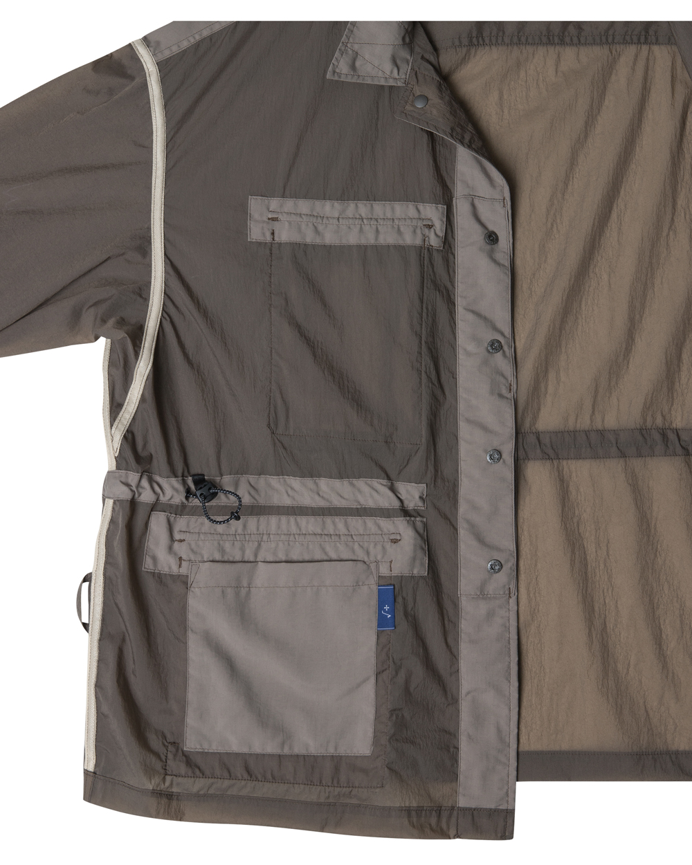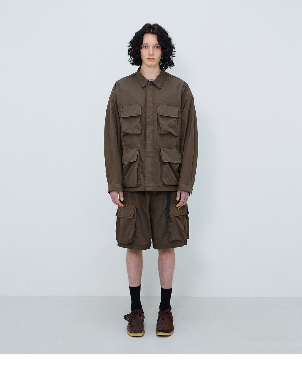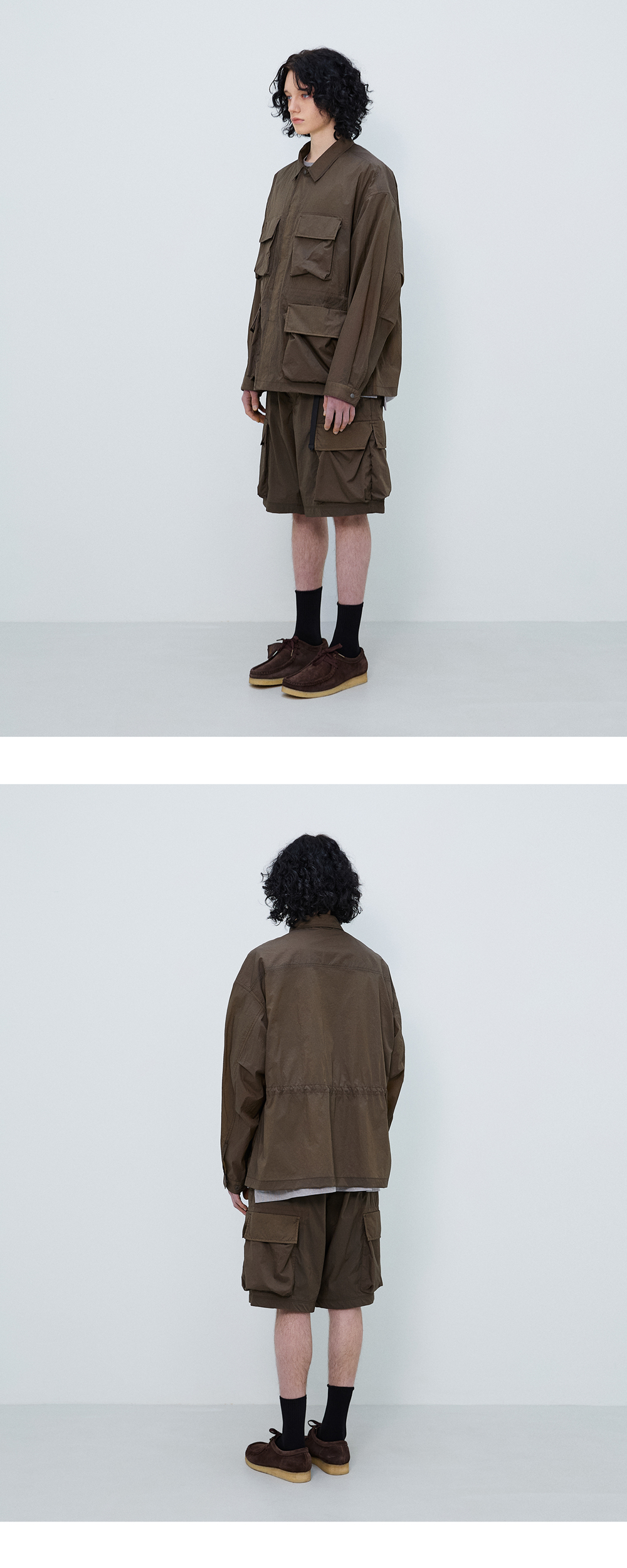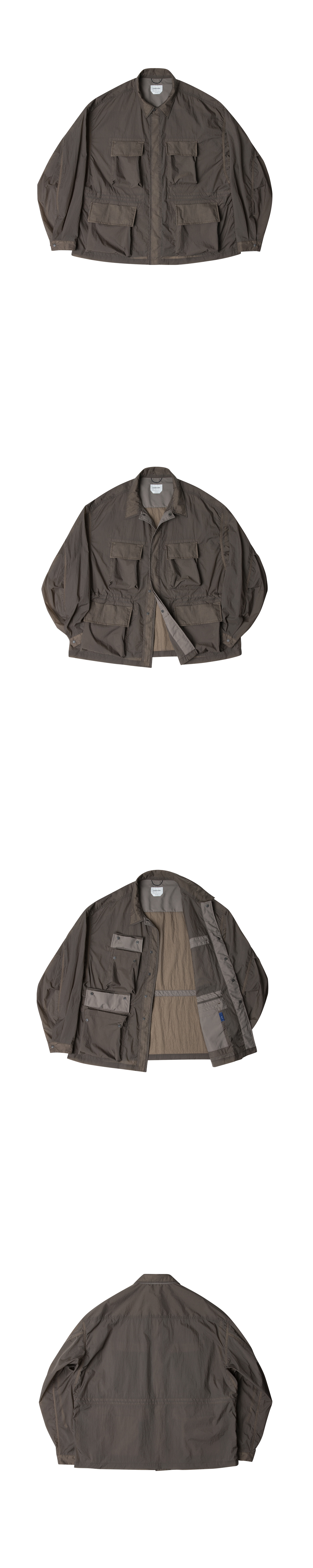 rootfinder® S/S 2025 ‘RE: LAYER’ Collection - B.D.U.의(전투복)의 매력적인 요소를 새롭게 해석한 디자인. - 전면의 상징적인 입체 카고 포켓, 사이드 포켓, 인사이드 포켓 설계로 수납력 극대화. - 컨버터블 칼라 디자인으로 단추를 여미거나 풀어서 연출. - 허리 실루엣 조절이 가능한 스트링 어저스터. - 드랍숄더의 오버 사이즈 실루엣. - 트라이 앵글 소매 패턴 설계로 편안한 활동성 제공. - 가벼운 착용감을 위해 홑겹으로 제작. - 절개의 모든 부위는 더블 스티치 처리하여 견고함을 더함. - 솔기의 시접은 전체 바인딩 처리하여 제품의 완성도를 높힘. - 경량 나일론(Yd/45g) 소재로 제작되어 가벼운 착용감과 하단의 부착된 포켓에 접어 넣어 휴대 용이. - 비침이 있는 소재로 절개 부위는 배색하여 은은하게 비치는 컬러 블록은 경쾌한 움직임을 더함. 모델 179cm M 사이즈 착용 중량 240g M 사이즈 기준