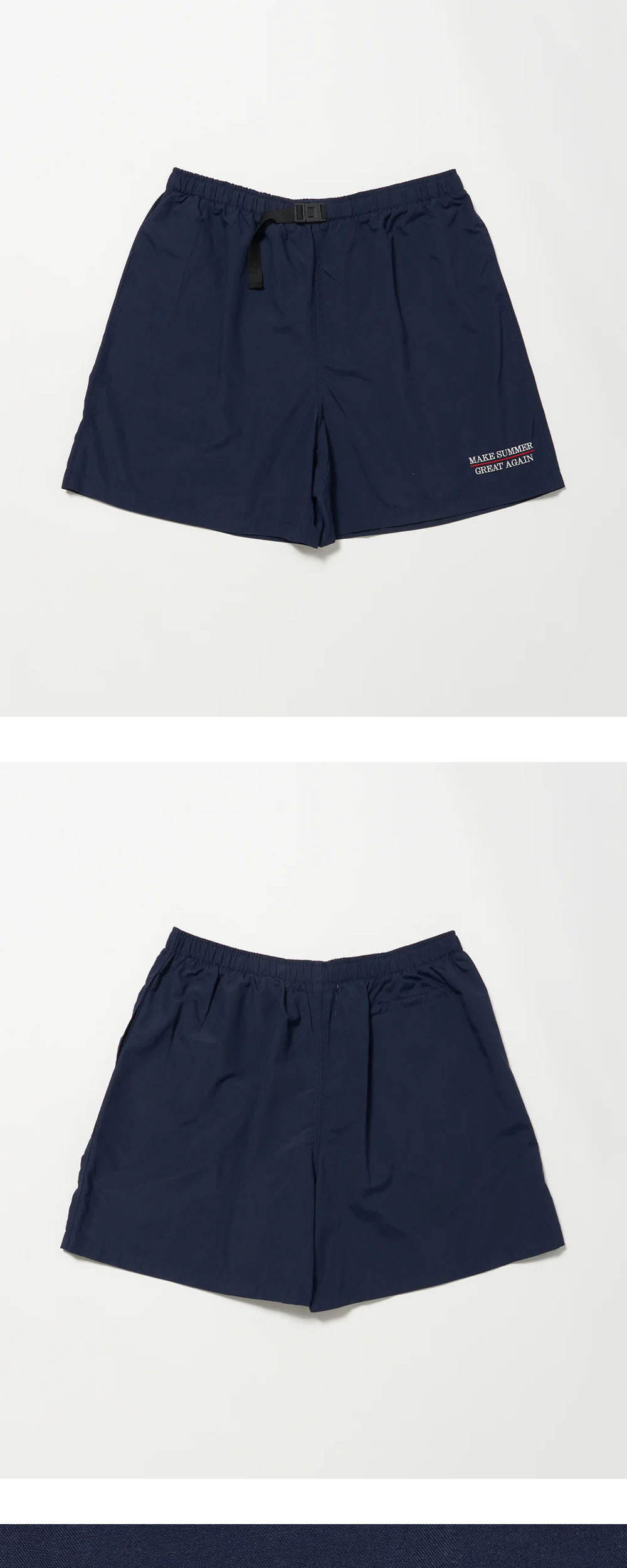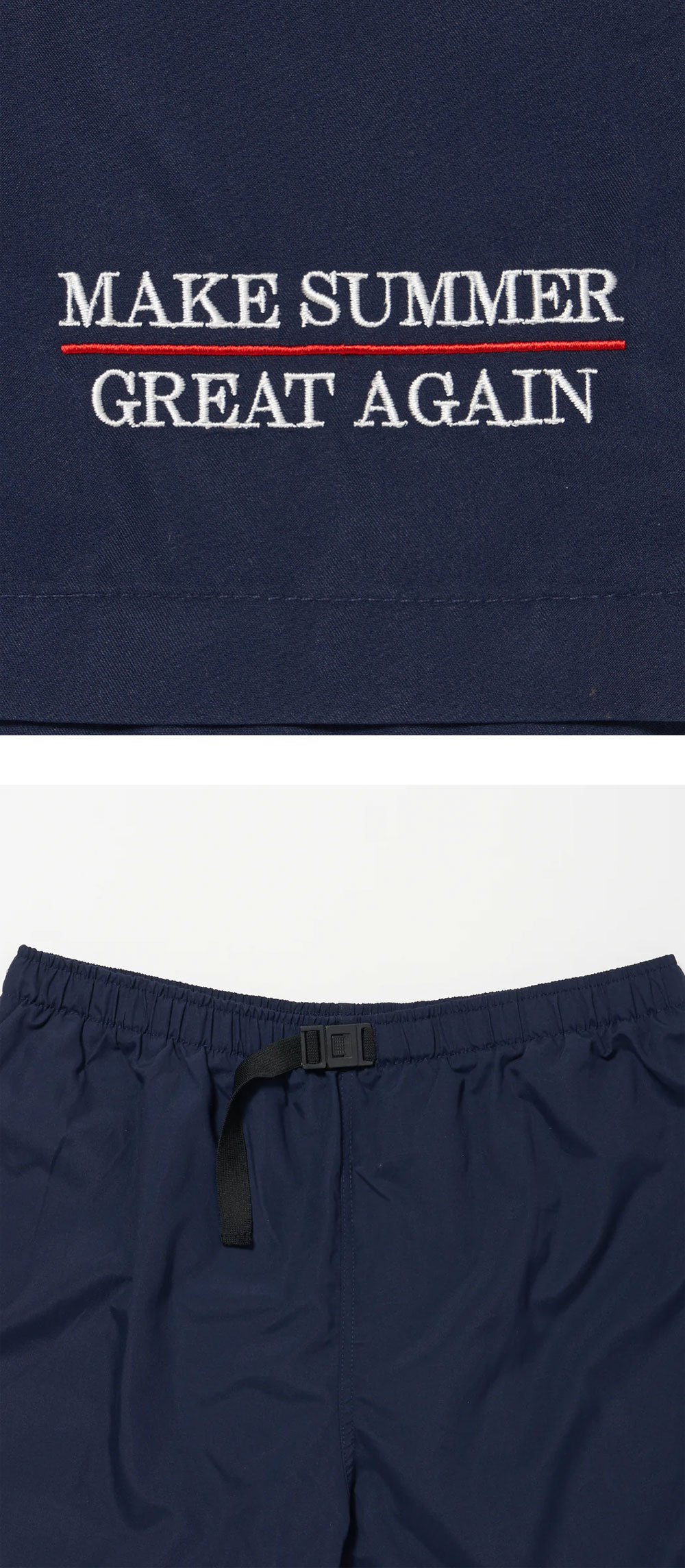 시원하고 가벼운 소재로 여름철 활용하기 좋은 에이오알의 메이크 썸머 그레이트 어게인 쇼츠 네이비입니다. - 우측 하단의 'make summer great again' 자수 디테일 - 허리 밴딩으로 편안한 착용감 - 허리 버클 디자인