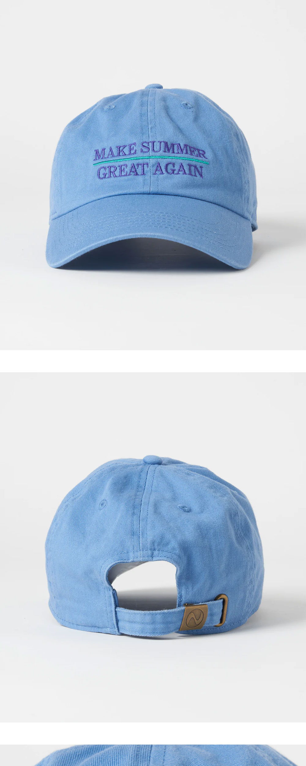 청량한 색감으로 포인트가 되어줄 에이오알의 메이크 썸머 그레이트 어게인 캡 스카이 블루입니다. - 전면 'Make Summer Great Again' 자수 - 후면 둘레 조절 스트랩 - 통기성과 착용감이 탁월한 면 100%으로 제작