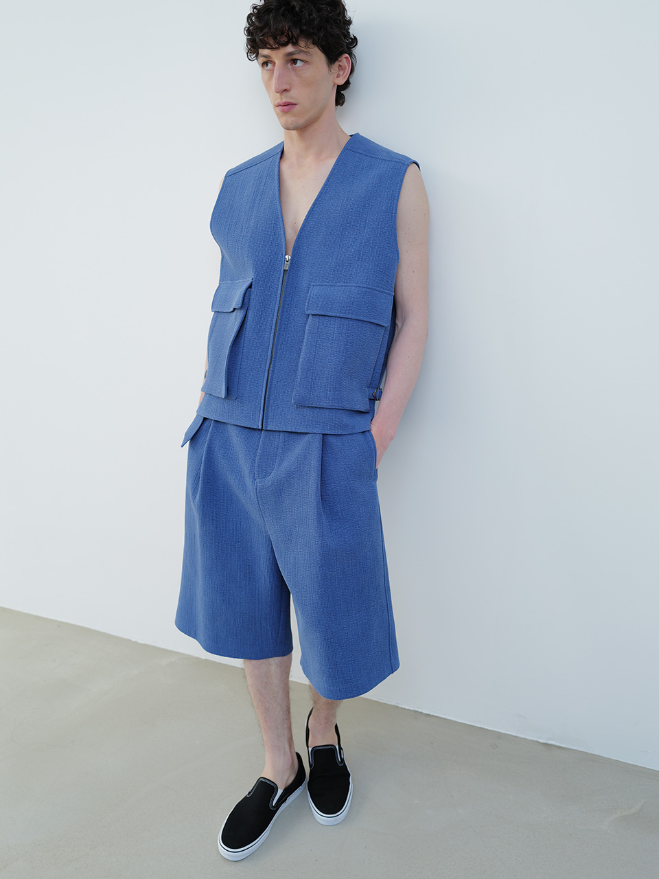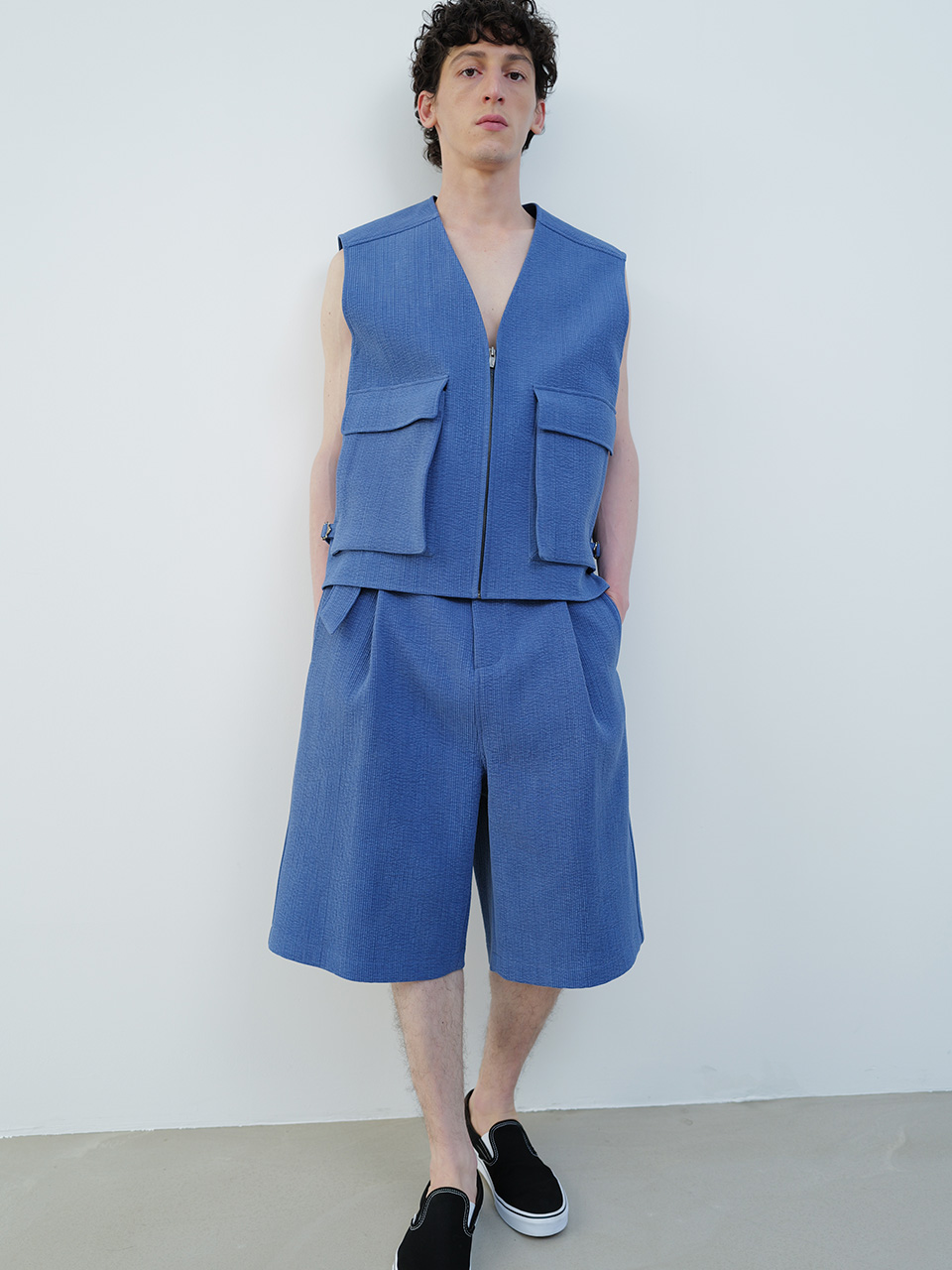 골지 소재의 코튼 원단으로 제작한 버뮤다 팬츠입니다. 여유로운 핏의 버뮤다 팬츠 기장의 팬츠 디자인으로 프론트의 깊은 투 턱 디테일로 포인트를 더했으며 제원단 벨트를 통해 사이즈를 조절해 착용이 가능합니다. 로고 각인된 소뿔 단추로 마무리하였습니다. QUILTED HALF SLEEVED SHIRT와 셋업으로 착용 가능합니다. *염색한 원단으로 밝은 옷과 입을 시 이염이 있을 수 있음* 46 허리 40.5CM 밑단 35CM 총장 63.5CM 앞밑위 39.5CM 48 허리 43CM 밑단 36CM 총장 64.5CM 앞밑위 40.5CM 50 허리 45.5CM 밑단 37CM 총장 65.5CM 앞밑위 41.5CM 치수는 재는 위치에 따라 1-3cm 차이 생길 수 있습니다. 어두운 원단은 염색되었기 때문에 밝은 아이템과 착용 시 주의 부탁드립니다. DRY CLEAN ONLY 180cm 마른체형 모델 48 SIZE 착용