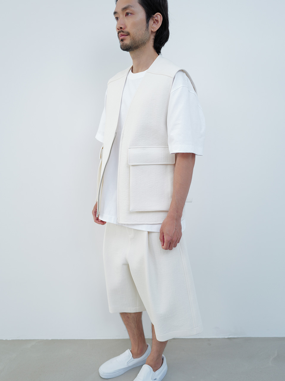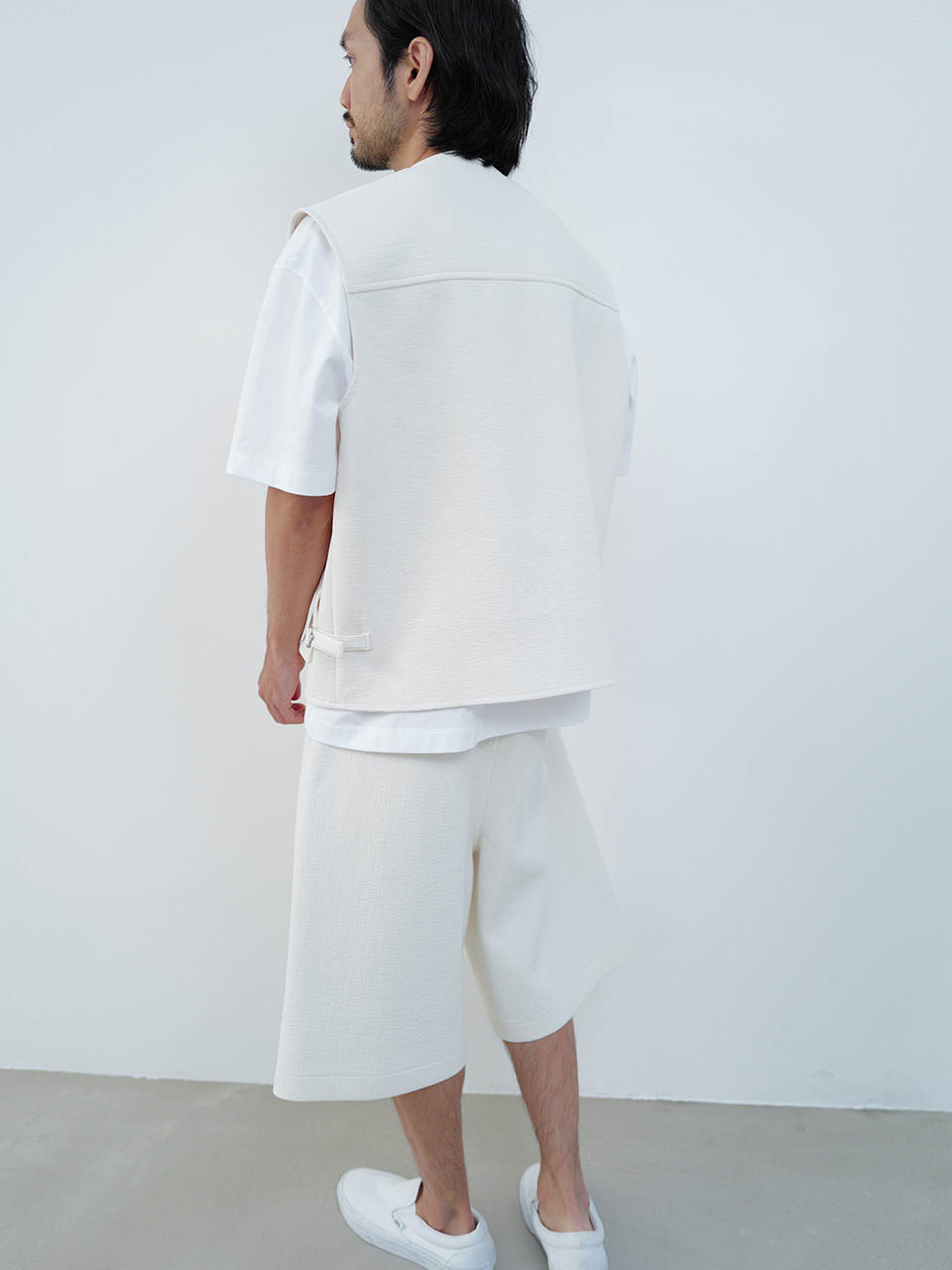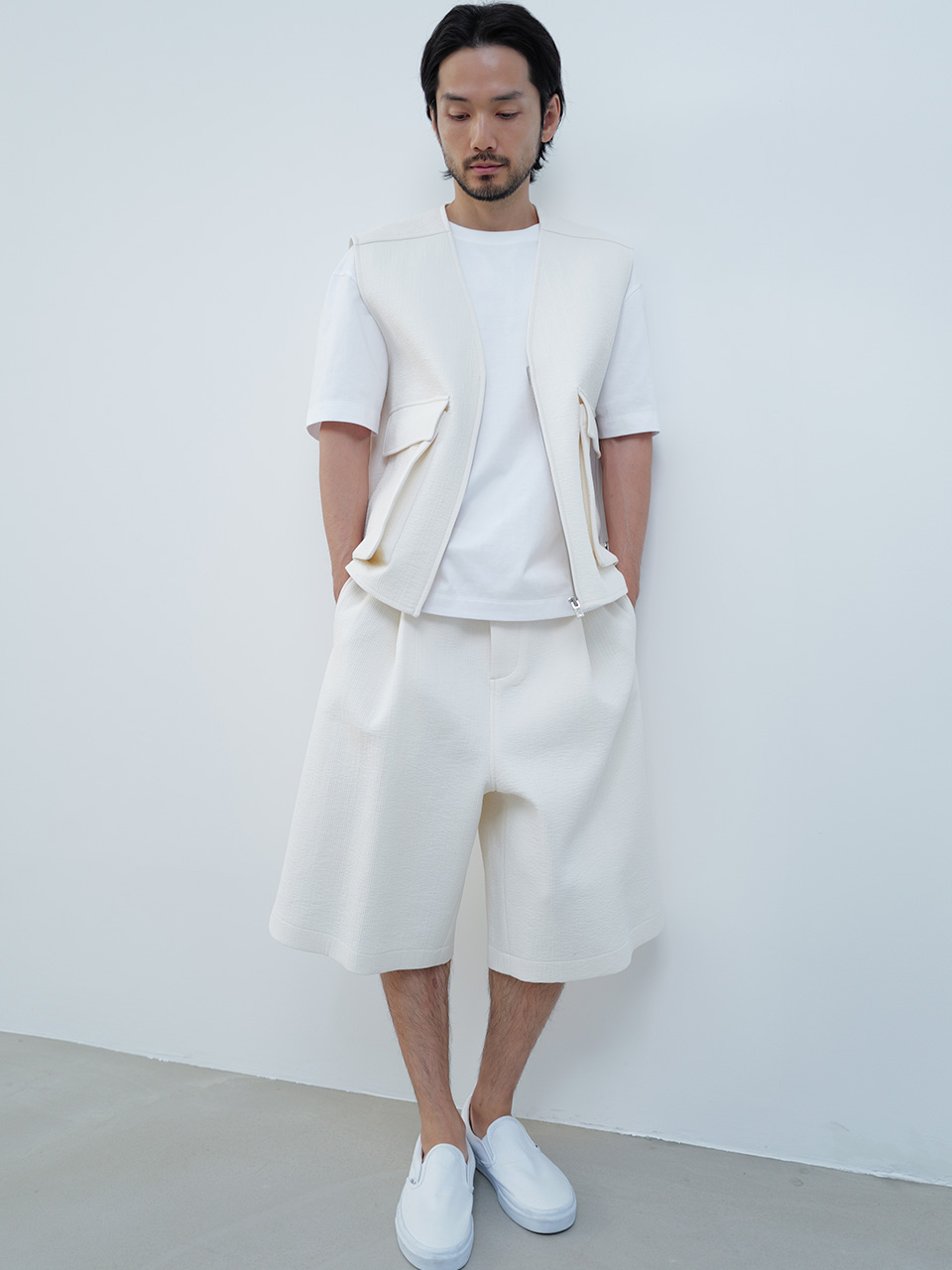 골지 소재의 코튼 원단으로 제작한 버뮤다 팬츠입니다. 여유로운 핏의 버뮤다 팬츠 기장의 팬츠 디자인으로 프론트의 깊은 투 턱 디테일로 포인트를 더했으며 제원단 벨트를 통해 사이즈를 조절해 착용이 가능합니다. 로고 각인된 지속 가능한 카제인 단추로 마무리하였습니다. QUILTED HALF SLEEVED SHIRT와 셋업으로 착용 가능합니다. 46 허리 40.5CM 밑단 35CM 총장 63.5CM 앞밑위 39.5CM 48 허리 43CM 밑단 36CM 총장 64.5CM 앞밑위 40.5CM 50 허리 45.5CM 밑단 37CM 총장 65.5CM 앞밑위 41.5CM 치수는 재는 위치에 따라 1-3cm 차이 생길 수 있습니다. 어두운 원단은 염색되었기 때문에 밝은 아이템과 착용 시 주의 부탁드립니다. DRY CLEAN ONLY 180cm 마른체형 모델 48 SIZE 착용