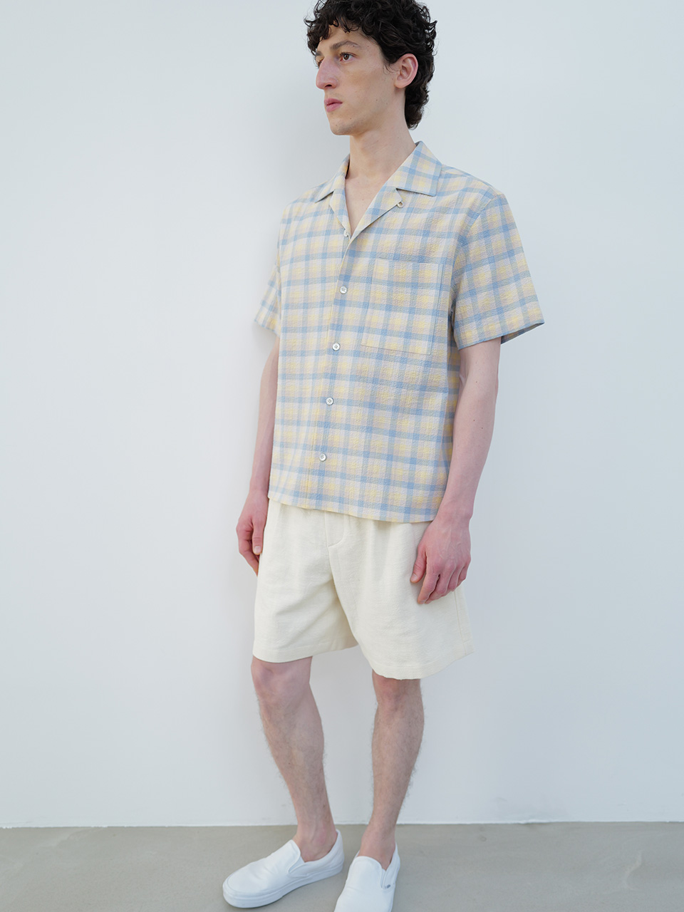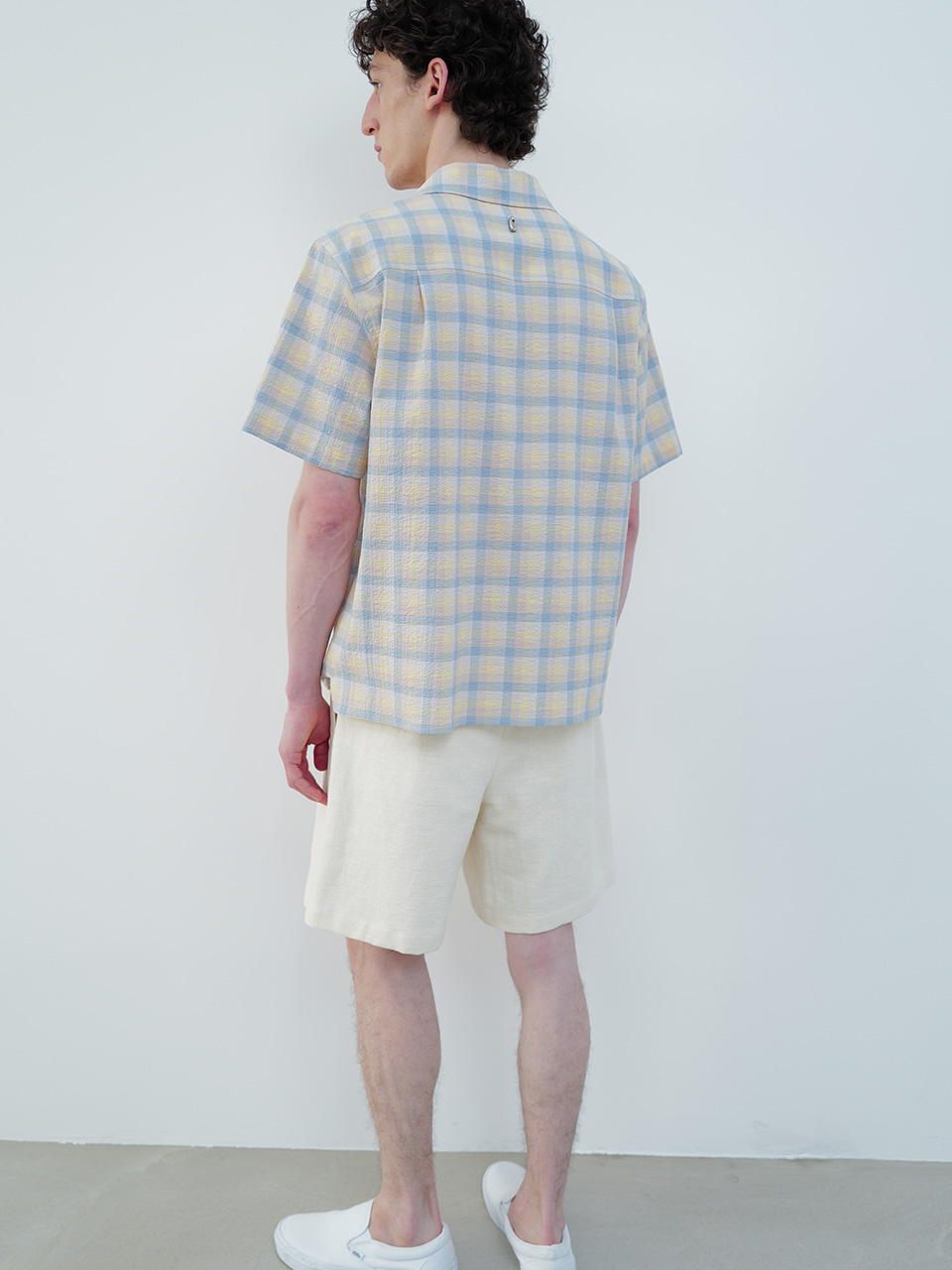 자연스러운 조직감과 요철감이 돋보이는 코튼 린넨 혼방 원단으로 제작한 쇼츠입니다. 여유로운 핏의 클래식한 투 턱 쇼츠 디자인으로 허리 부분의 어저스터 버클을 통해 허리 사이즈 조절이 가능합니다. BACK의 한쪽만 들어가는 플랩 포켓 디테일로 포인트를 주었습니다. 로고 각인된 지속 가능한 카제인 단추로 마무리하였습니다. *린넨 원단 특성상 주름 자국과 실뭉침이 있을 수 있음* 46 허리 39.5CM 밑단 32.5CM 총장 47CM 앞밑위 32.5CM 48 허리 42CM 밑단 33.5CM 총장 48CM 앞밑위 33.5CM 50 허리 44.5CM 밑단 34.5CM 총장 49CM 앞밑위 34.5CM 치수는 재는 위치에 따라 1-3cm 차이 생길 수 있습니다. 어두운 원단은 염색되었기 때문에 밝은 아이템과 착용 시 주의 부탁드립니다. DRY CLEAN ONLY 180cm 마른체형 모델 48 SIZE 착용