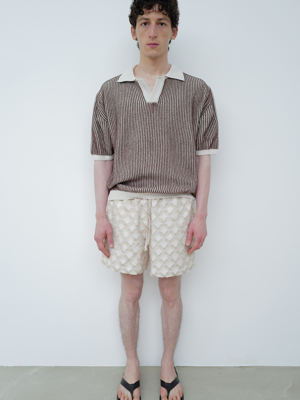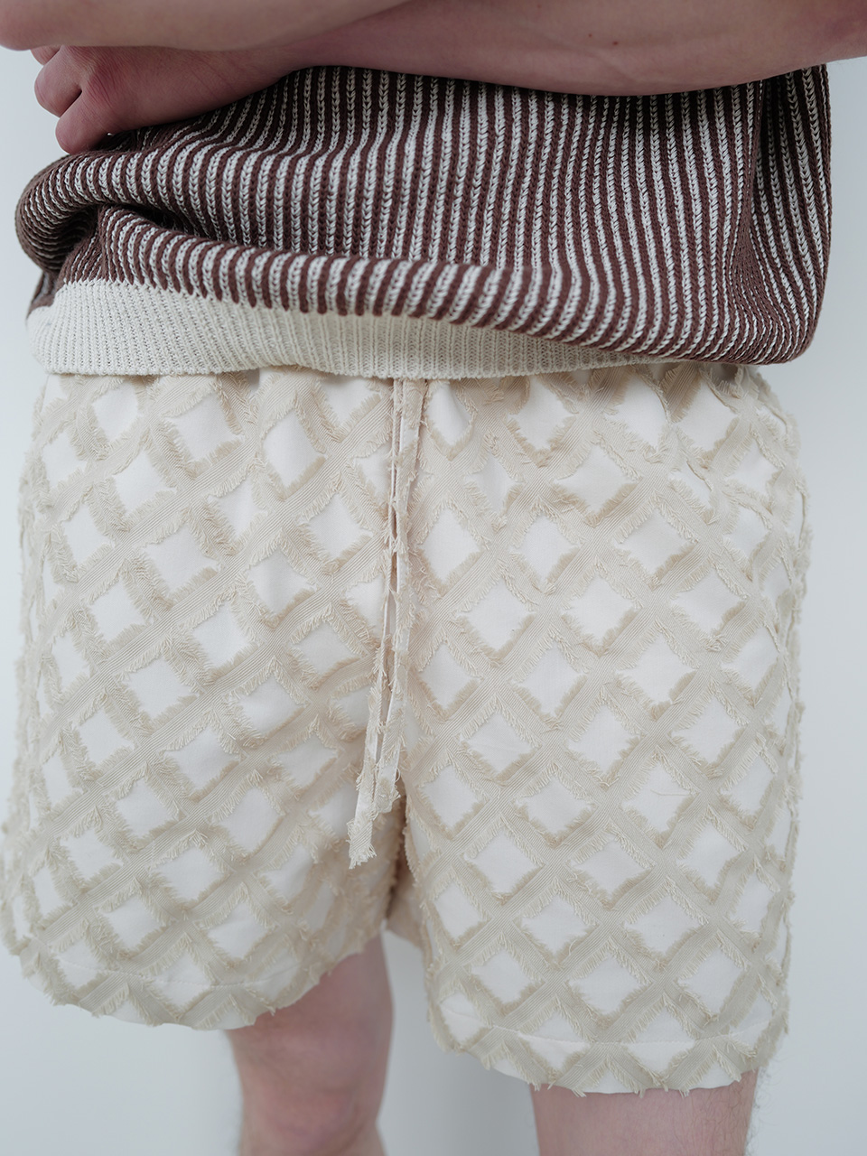 FABRIC MADE IN JAPAN 유니크한 아가일 패턴의 헤어리 자가드 원단으로 제작한 쇼츠입니다. 여유로운 핏의 쇼츠 디자인으로 허리 전체의 밴드로 편한 착용감을 제공하며 허리의 제원단 끈을 이용해 허리 사이즈 조절이 가능합니다. 소재 특성상 주름에 강해 캐주얼하게 착용이 가능합니다. BACK에 아웃포켓을 더해 편리함을 더했으며 허리 안쪽의 골테이프로 견고함을 더해 마무리하였습니다. 46 허리 35.5CM 엉덩이 54.5CM 허벅지 36.5CM 밑단 34CM 총장 41CM 앞밑위 28CM 48 허리 38CM 엉덩이 57CM 허벅지 38CM 밑단 35.5CM 총장 42CM 앞밑위 29CM 50 허리 40.5CM 엉덩이 59.5CM 허벅지 39.5CM 밑단 37CM 총장 43CM 앞밑위 30CM 치수는 재는 위치에 따라 1-3cm 차이 생길 수 있습니다. DRY CLEAN ONLY 180cm 마른체형 모델 48 SIZE 착용