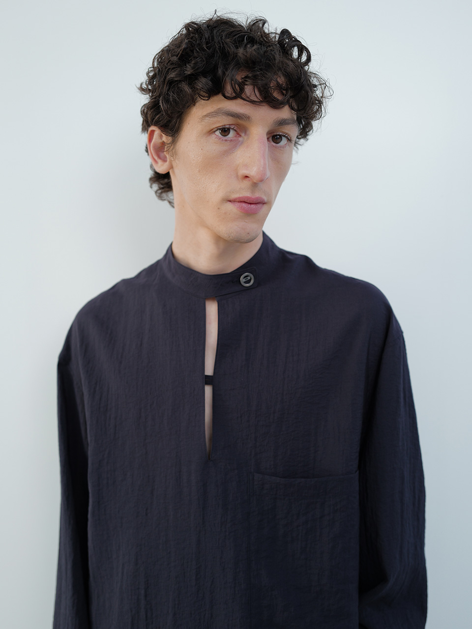 소재 특유의 요철감과 청량감이 특징인 레이온과 나일론 혼방 소재로 제작한 셔츠입니다. 박시한 실루엣의 밴드넥 아노락 디자인의 셔츠로 여름철 캐주얼하게 연출하기 좋습니다. 프론트 트임 안쪽과 네크 안쪽의 단추를 이용한 여밈이 있으며 프론트 아웃 포켓으로 편리함을 더했습니다. 로고 각인된 메탈 단추와 소뿔 단추, 그리고 개발한 심볼 금속 장식으로 마무리하였습니다. 46 어깨 58CM 가슴 63.5CM 총장 72.5CM 밑단 61.5CM 소매 58CM 48 어깨 60CM 가슴 66CM 총장 73.5CM 밑단 64CM 소매 59CM 50 어깨 62CM 가슴 68.5CM 총장 74.5CM 밑단 66.5CM 소매 60CM 치수는 재는 위치에 따라 1-3cm 차이 생길 수 있습니다. 어두운 원단은 염색되었기 때문에 밝은 아이템과 착용 시 주의 부탁드립니다. DRY CLEAN ONLY 180cm 마른체형 모델 48 SIZE 착용