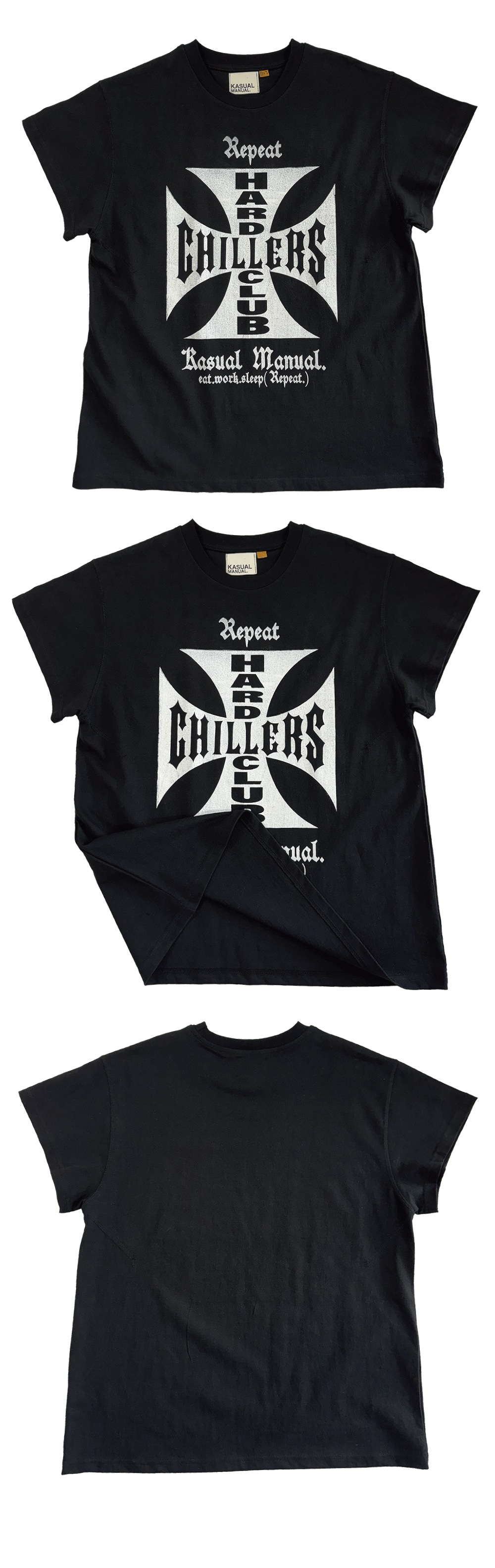 반복되는 일상 속에서도 ‘하드하게 칠’하는 이들을 위한 Kasual Manual의 위트 있는 제안. 고전적인 Iron Cross(철십자) 형태의 디자인을 스트리트 무드로 재해석한 이번 티셔츠는, 하드코어한 감성과 쿨한 여유를 동시에 담아냅니다. 패러디를 통해 브랜드 고유의 유쾌한 시선과 철학을 담아낸 시그니처 아이템. 디자인 포인트 •전면 중앙의 “HARD CHILLERS CLUB” 그래픽은 클래식한 아이콘을 위트 있게 오마주 •Kasual Manual의 핵심 메시지 “eat.work.sleep (Repeat.)”으로 마무리되는 센스 •패러디 요소를 현대적 감성으로 풀어낸 독창적인 그래픽 티셔츠