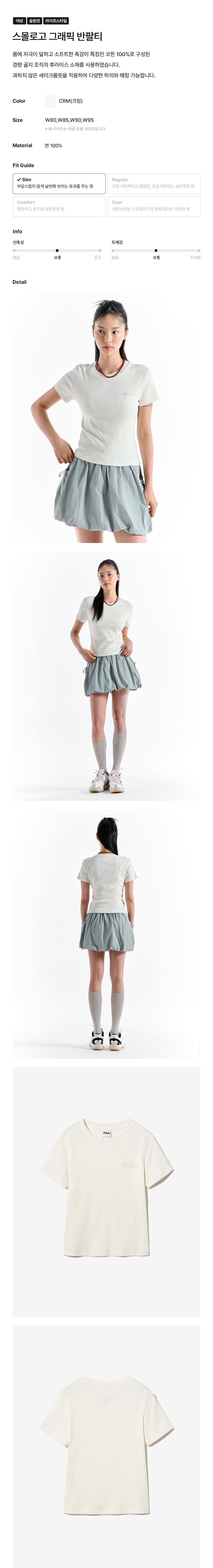 몸에 자극이 덜하고 소프트한 촉감이 특징인 코튼 100%로 구성된 경량 골지 조직의 후라이스 소재를 사용하였습니다. 과하지 않은 세미크롭핏을 적용하여 다양한 하의와 매칭 가능합니다.