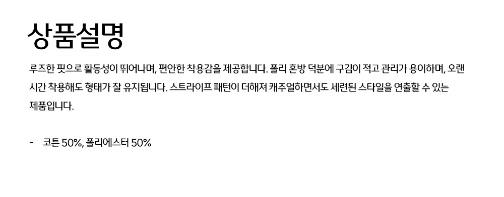 루즈한 핏으로 활동성이 뛰어나며, 편안한 착용감을 제공합니다. 폴리 혼방 덕분에 구김이 적고 관리가 용이하며, 오랜 시간 착용해도 형태가 잘 유지됩니다. 스트라이프 패턴이 더해져 캐주얼하면서도 세련된 스타일을 연출할 수 있는 제품입니다.