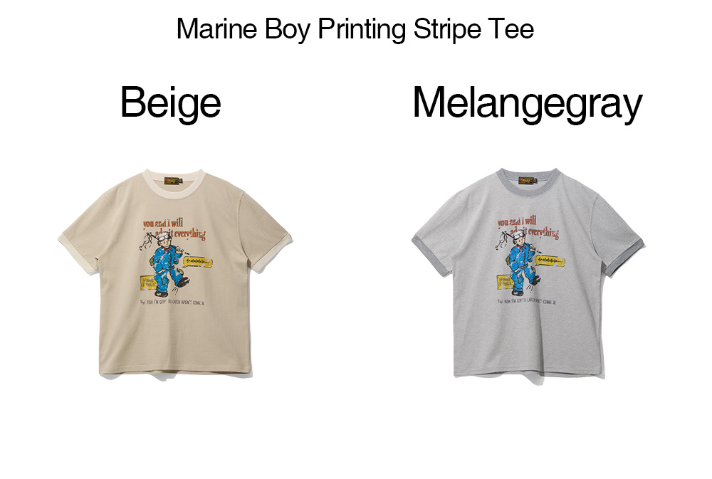 잔잔한 스트라이프 패턴 위에 여유로운 실루엣을 더한 반팔 티셔츠는 캐주얼하면서도 빈티지한 감성의 마린보이 그래픽을 감각적으로 배치해 원단이 은은하게 비치는 텍스처가 느껴지며 브랜드만의 독창적인 무드를 보여주는 제품입니다.