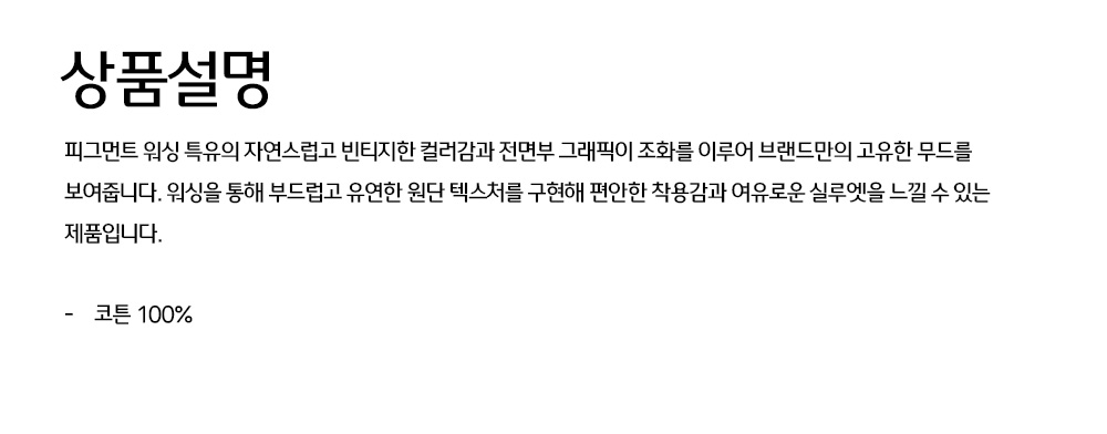 피그먼트 워싱 특유의 자연스럽고 빈티지한 컬러감과 전면부 그래픽이 조화를 이루어 브랜드만의 고유한 무드를 보여주며, 워싱을 통해 부드럽고 유연한 원단 텍스처를 구현해 편안한 착용감과 여유로운 실루엣을 느낄 수 있는 제품입니다