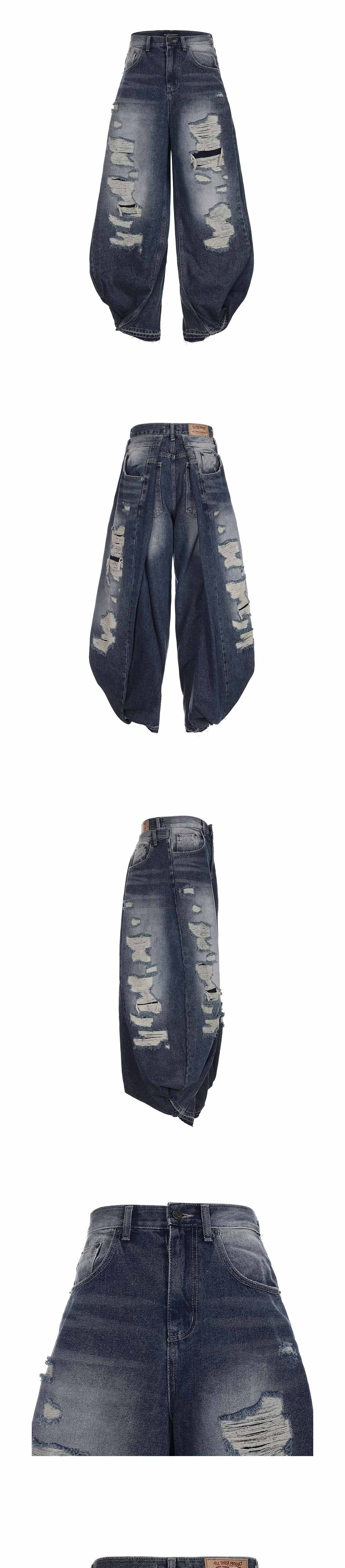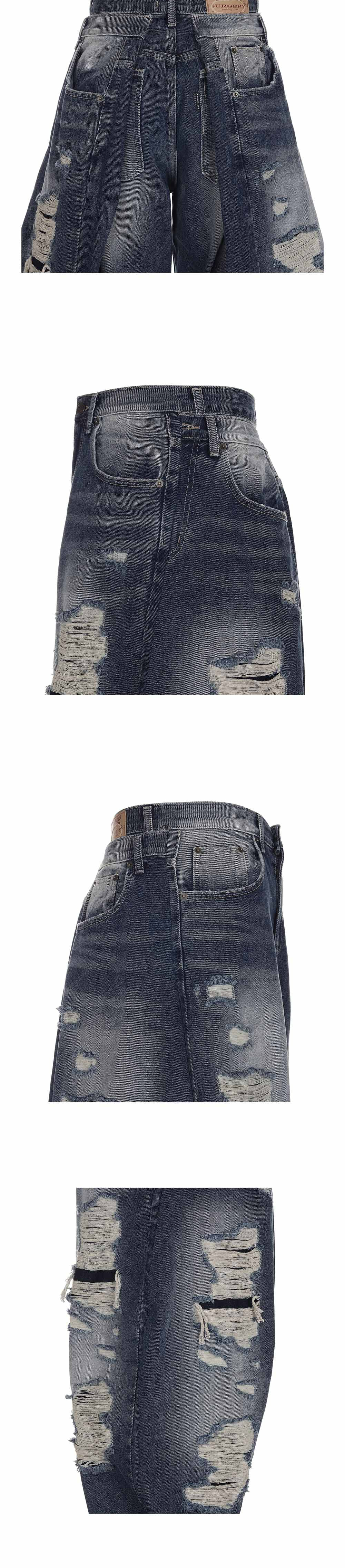 써저리 더블 폴딩 오버 와이드 배기 진 디스트로이드 블루