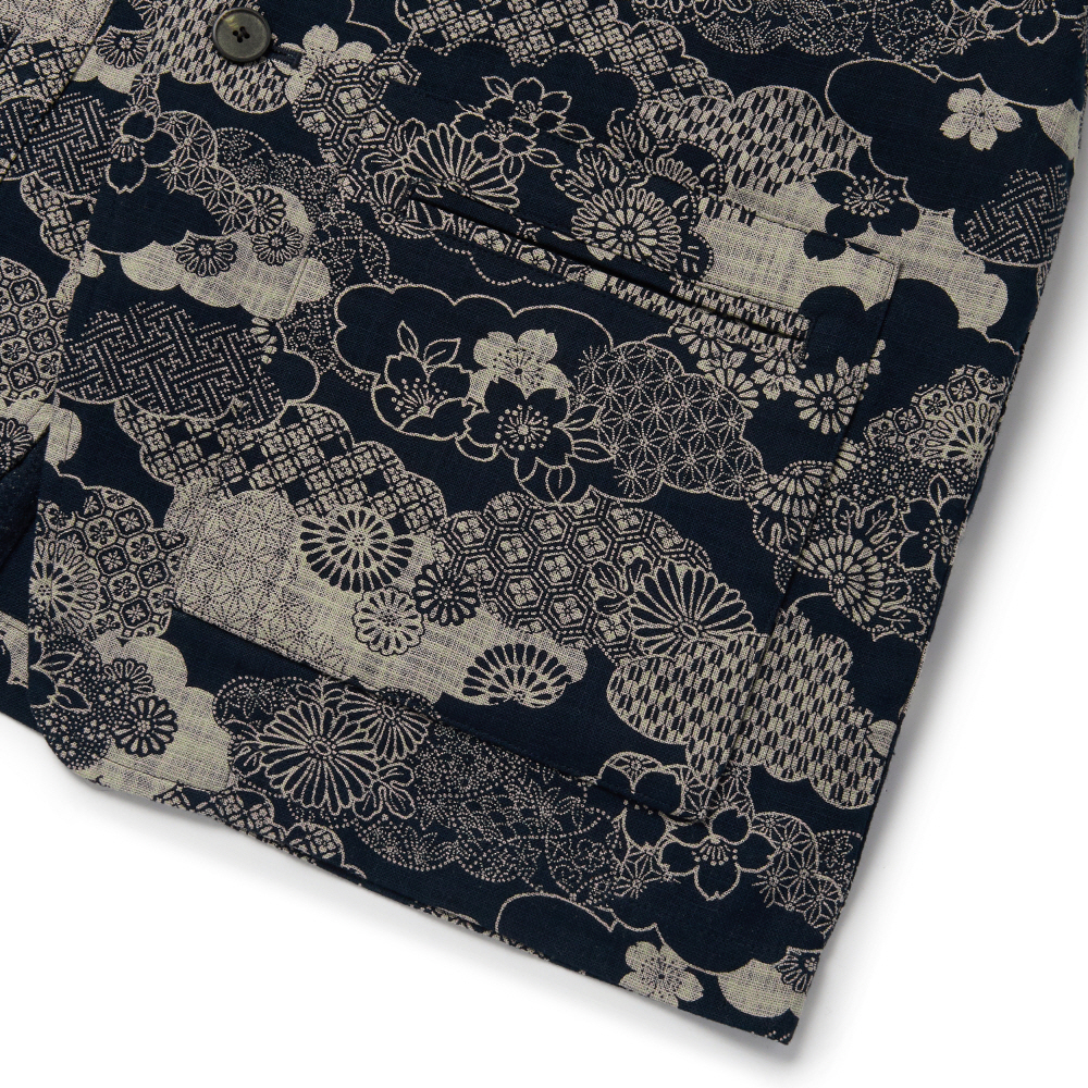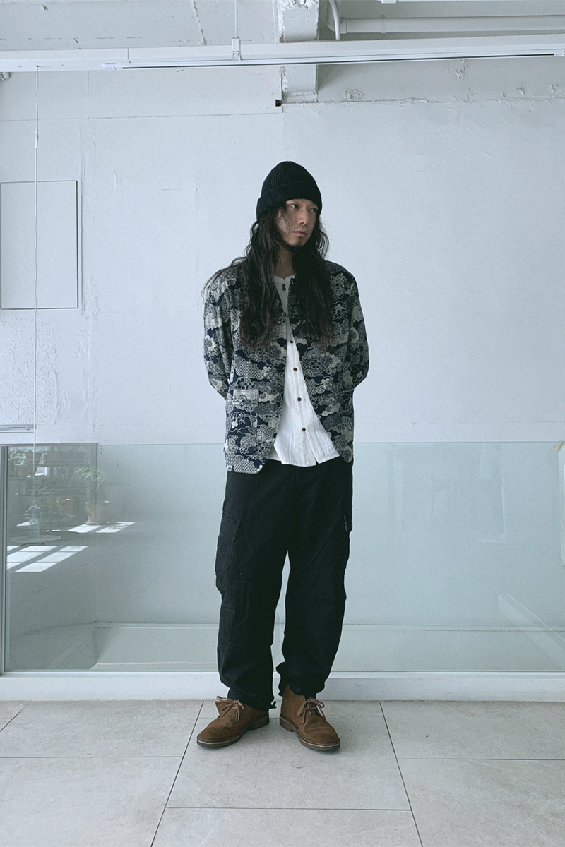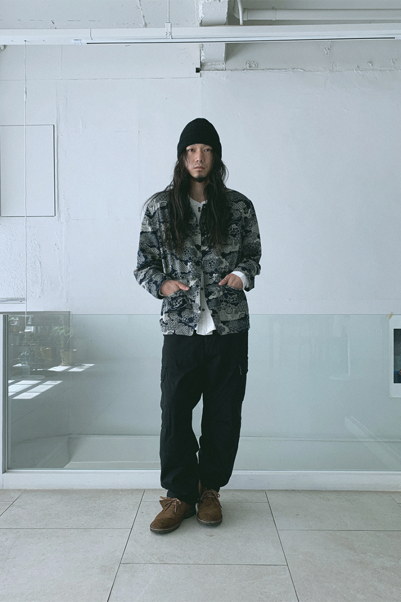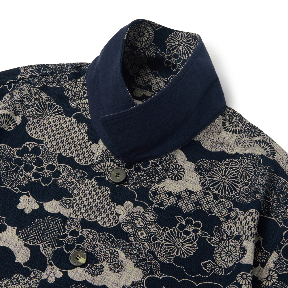 제품정보. - 동양적인 무드의 패턴이 돋보이는 일본 수입원단 활용 - 여유로운 사이즈의 프렌치 워크 자켓 실루엣 - 원단 부하가 없도록 전면 인사이드 패치포켓 디자인 활용 - 소매 및 밑단 등 마찰이 잦은 부분의 히든 배색 디테일 - 원단의 무게감과 어울리는 소뿔 단추 활용 More Info. - Cotton 100% - Heather Navy - Size 2,3 - Made In Korea