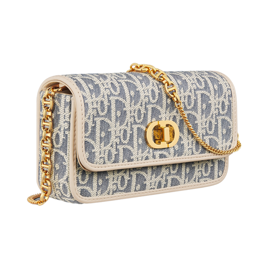 디올 스몰 미스 카로 파우치 체인 디올 오블리크 샴브레이 라피아 이펙트 앤드 스무스 카프스킨 라이트 비스킷 화이트