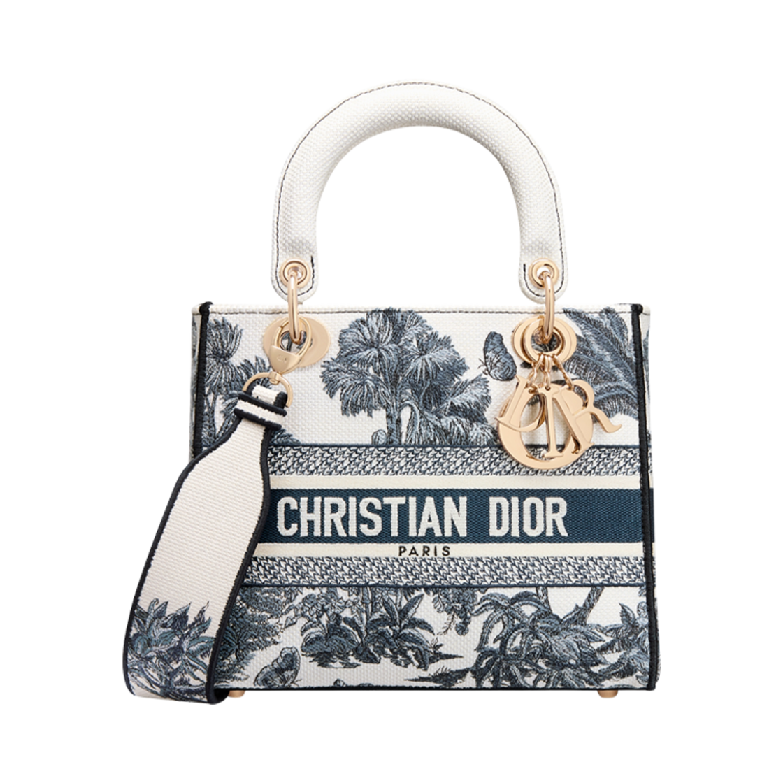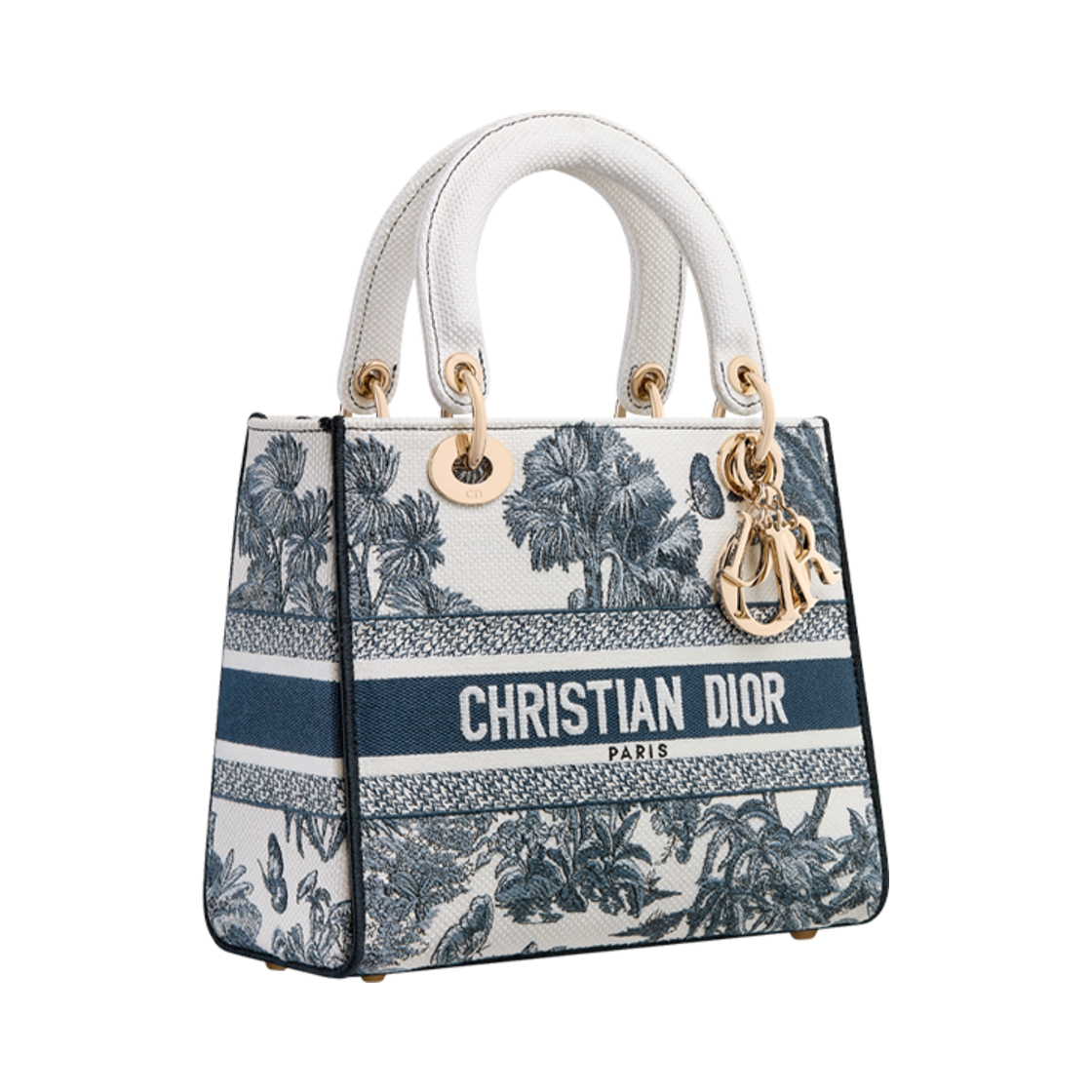 Dior Dioriviera Medium Lady D-Lite Bag Toile De Jouy Palms Embroidery White Blue