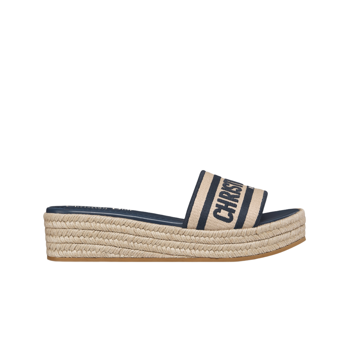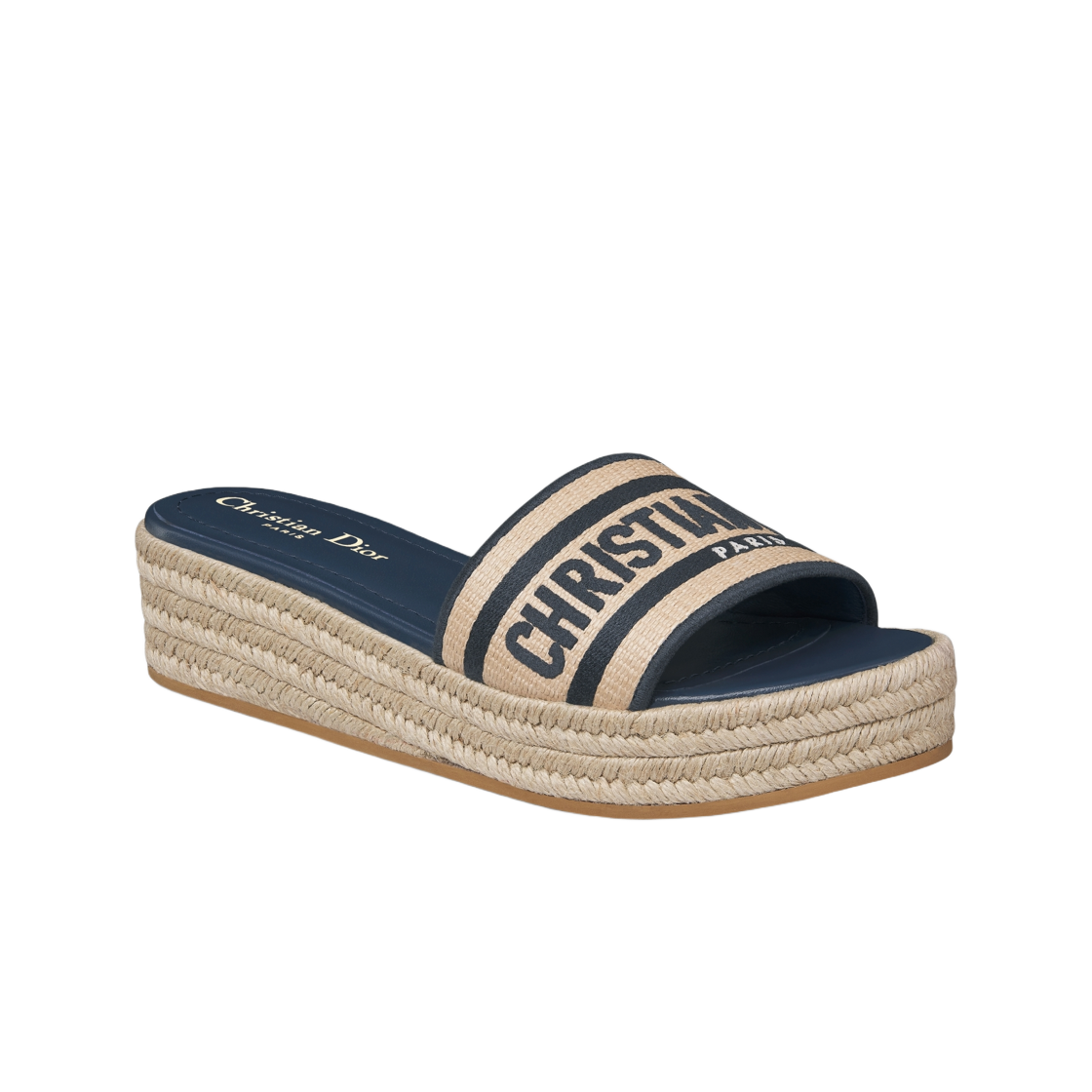(W) Dior Dway Platform Slide Embroidered Cotton Natural Raffia Deep Blue