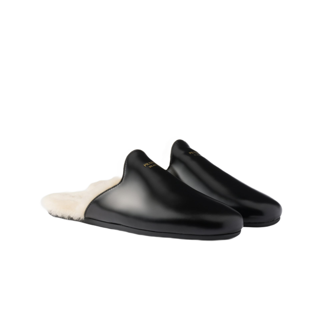 (W) Prada Brushed Leather and Shearling Mules Black