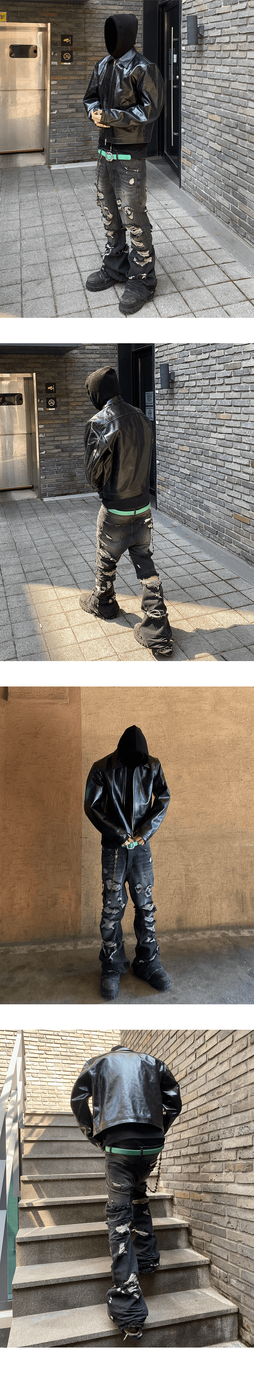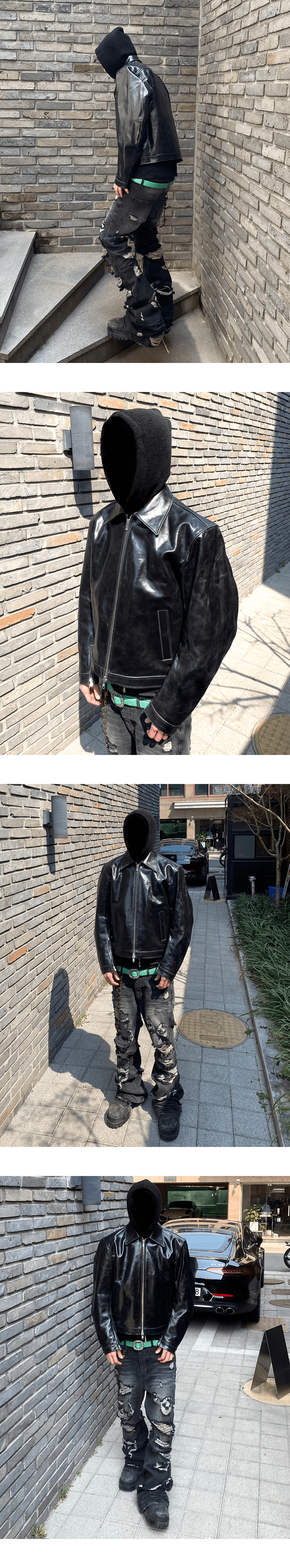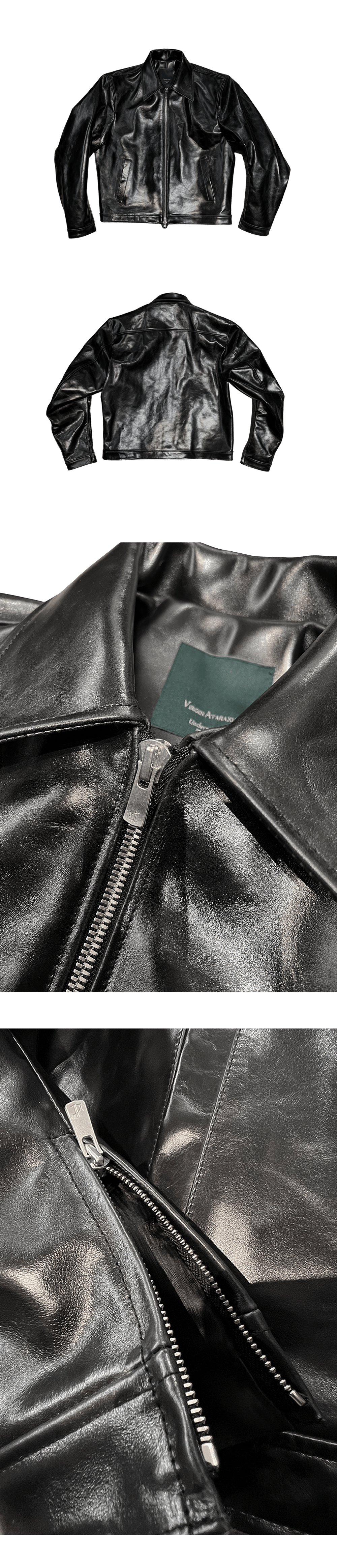 - 광택있는 소가죽을 사용해 제작한 라이더자켓입니다. - 각진 어깨와 여유있는 소매, 크롭한 기장이 특징이며 착용하며 생기는 주름이 매력적입니다. - 한국에서 소량 제작되었습니다.