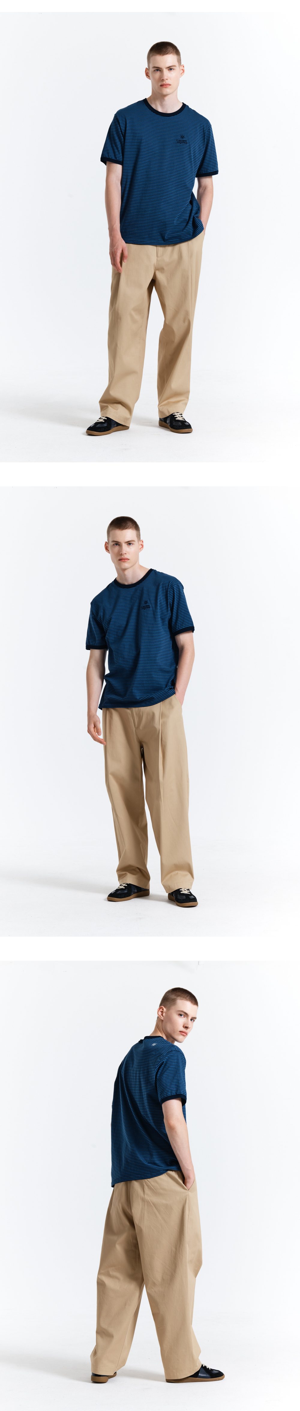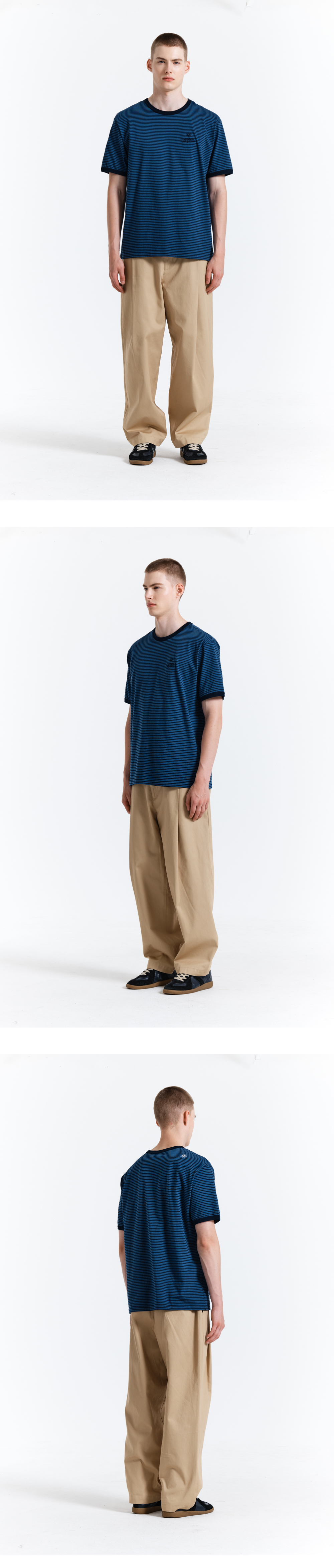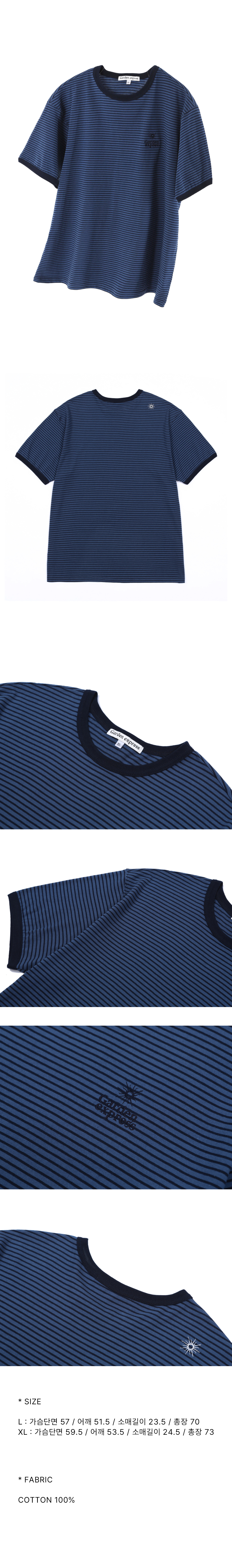 - 가든익스프레스의 로고와 심볼이 심플하게 자수처리된 반팔 티셔츠입니다. - 잔 스트라이프로 부담스럽지 않고 편안하게 착용할 수 있으며, 은은한 블루 X네이비 스트라이프의 고급스러운 컬러감이 여름철 단품 착용시에도 포인트를 살려줍니다. - 넥라인과 소매라인을 랍바처리하여 세탁시 변형이 적습니다. - 20수의 여름철에 알맞은 두께감에 탄탄한 소재로 몸의 실루엣을 과하게 드러내지 않아 편안하게 착용할 수 있습니다. - 뒷면 어깨에 심볼 로고를 자수처리했습니다.