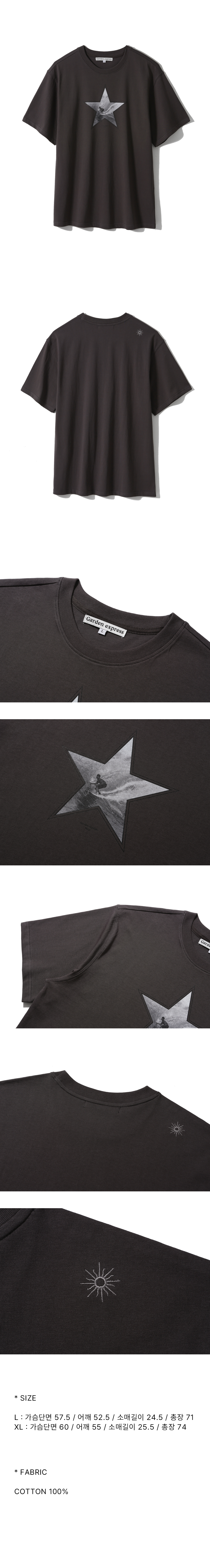 - 서퍼 이미지가 담긴 별 그래픽이 프린팅된 티셔츠입니다. - 고밀도로 짜인 16수 코마사 싱글 원단을 사용해 탄탄한 착용감을 느낄 수 있으며, 바이오 워싱 가공으로 세탁 후에도 수축과 변형이 적습니다. - 단독으로는 물론, 이너로도 스타일에 포인트를 더해줍니다. - 어깨 뒤쪽에는 심볼 자수를 더해 디테일을 완성했습니다.