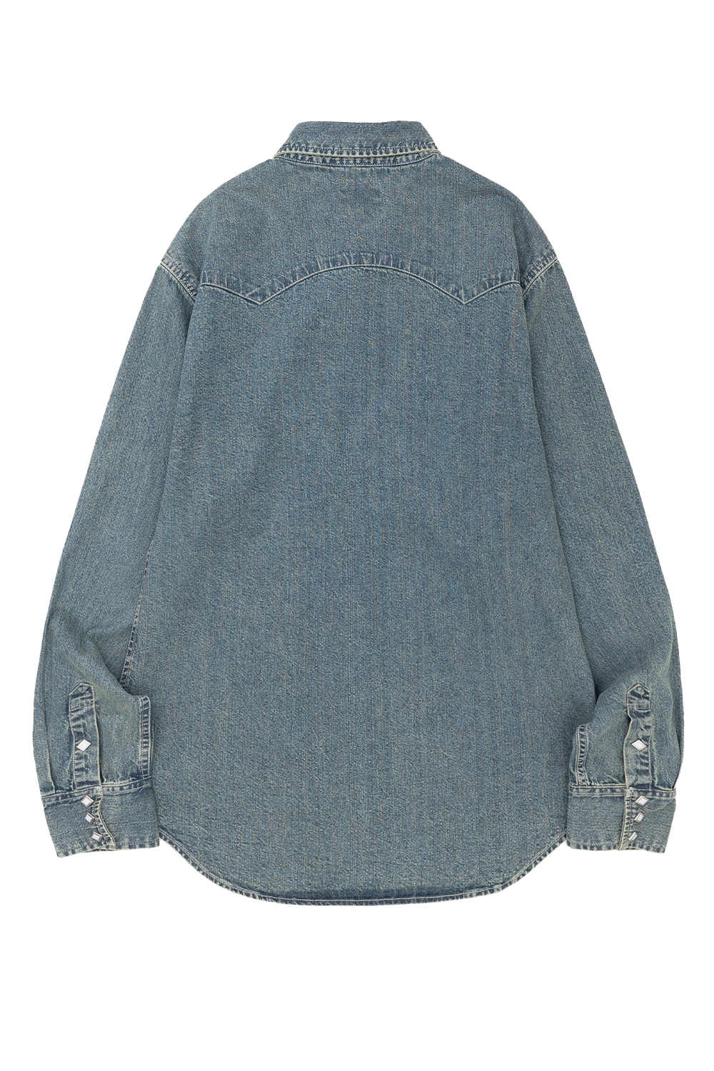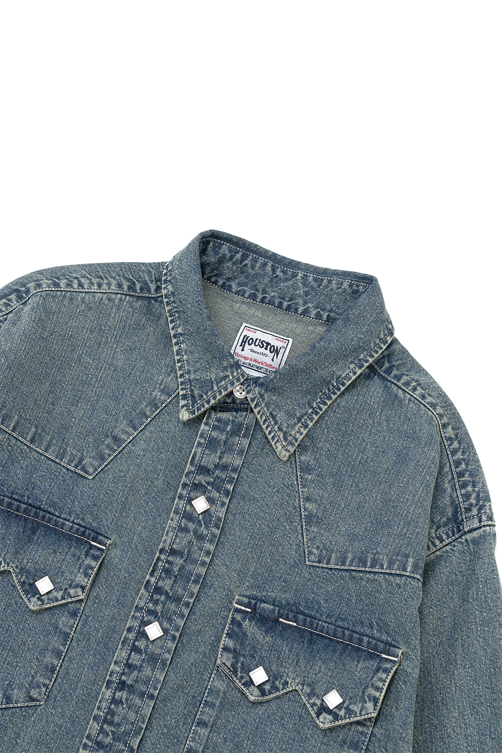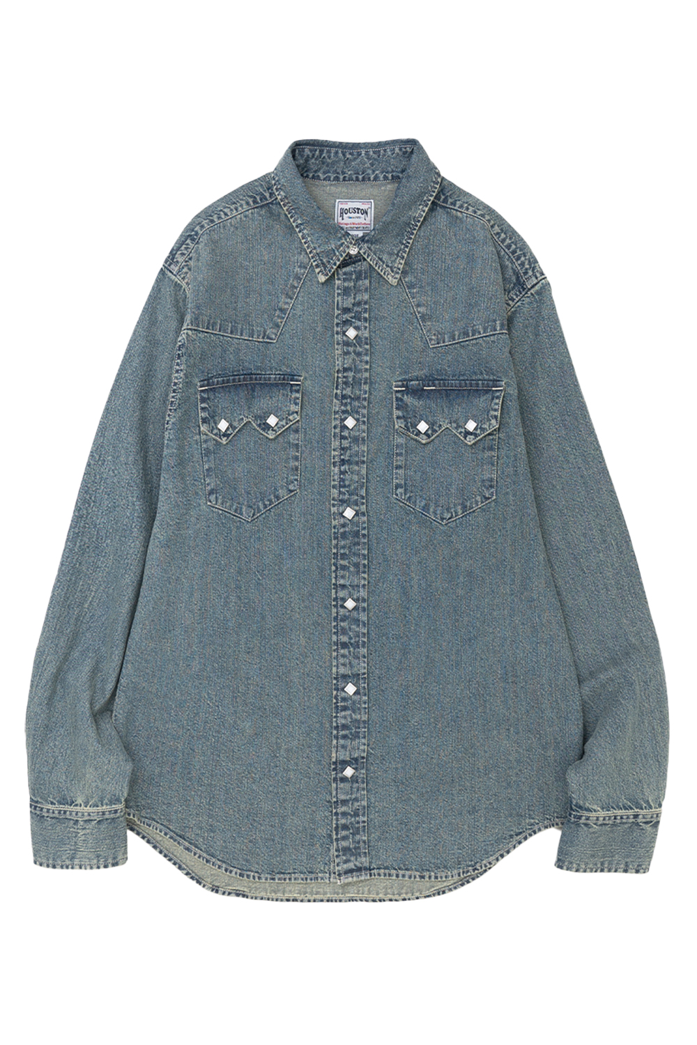 Houston Japan 41186 Denim Western Shirt - Bleach 웨스턴 셔츠 중에서도 이른바 쇼트 혼 타입을 재현한 상품입니다. 톱형의 플랩 포켓과 테트라형의 펄 스냅 버튼을 채용한 것이 특징입니다. 저스트한 기장감과 단품으로도 포인트가 되는 제품입니다. * Cotton 100% * 빛에 의한 제품의 색감 차이가 존재 할 수 있습니다. * Made in India