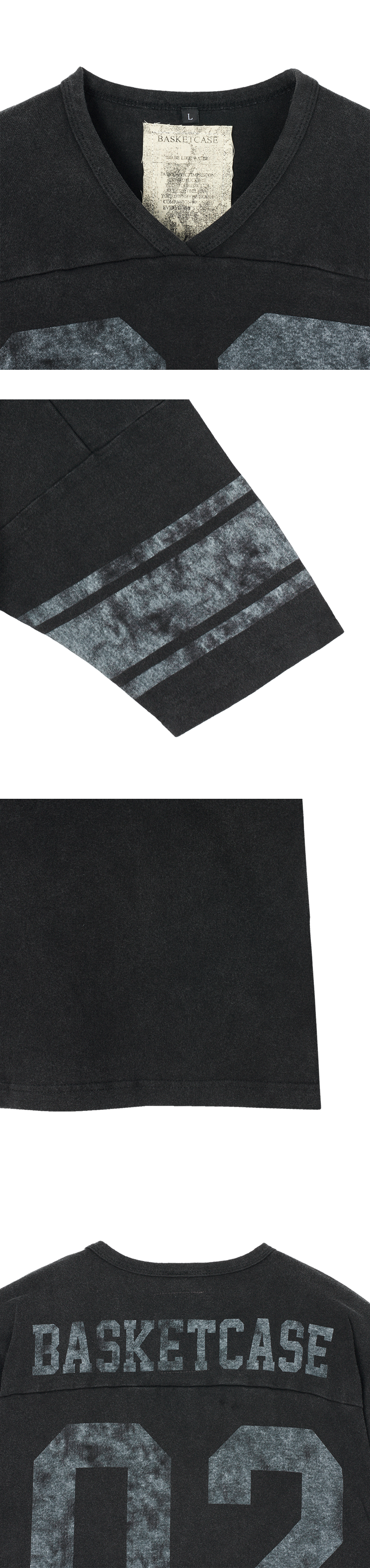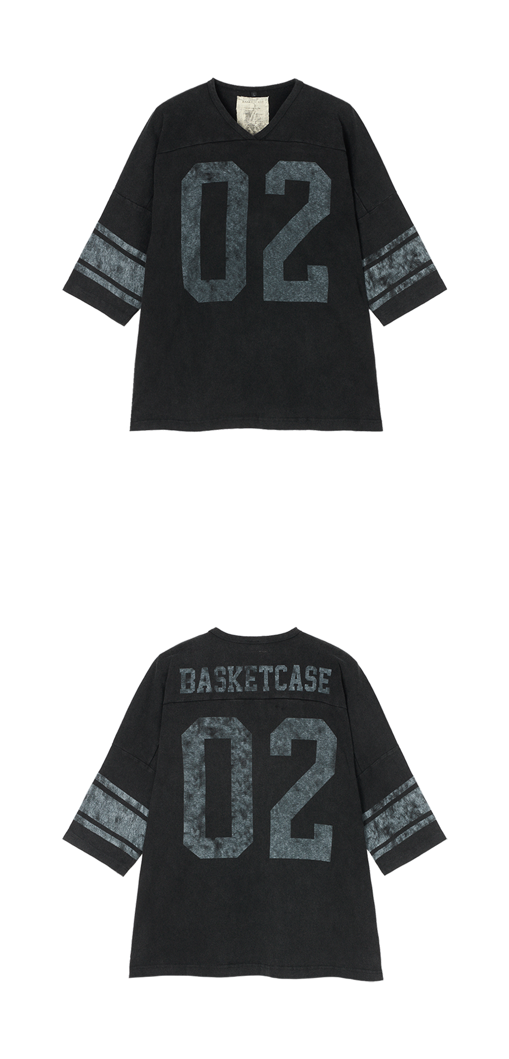 빈티지하면서도 스포티한 무드가 느껴지는 바스켓케이스의 홀스카라 풋볼 셔츠 쇼트 슬리브 블랙입니다. - 전면 및 후면의 넘버 '02' 프린트 - 빈티지 피그먼트 다잉 - 후면 브랜드 로고 디테일 - 부드럽고 편안한 착용감 - 드롭숄더 핏