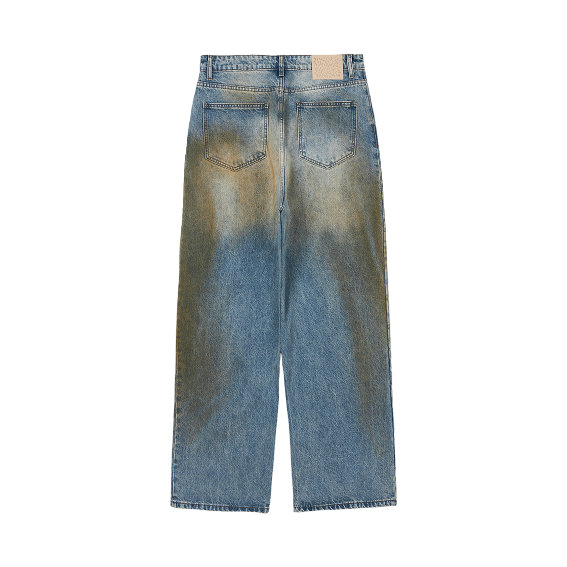 빈티지한 워싱이 돋보이는 바스켓케이스의 랙스 배기 데님 머드 워시 블루 더트입니다. - 오래 입은듯한 자연스러운 워싱 다지안 - 자연스럽게 흐르는 핏 - 허리 뒷면 패치 디테일