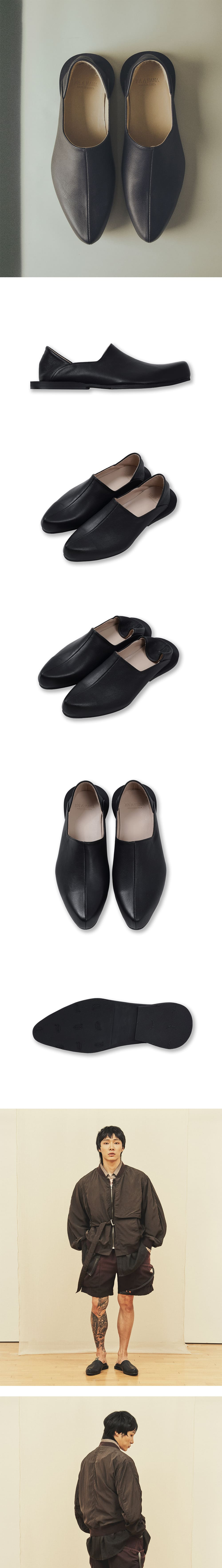 [가죽] 겉감은 염소 가죽을 사용했습니다. 표면에 은은한 요철이 있으며, 부드럽습니다. 수분 저항력과 신축성 또한 특장점입니다. [디테일] 어퍼의 중앙을 가로지르는 세로 선과 슬림한 라스트 그리고 살짝 들린 앞코가 특징적인 로퍼입니다. 조선 시대의 신발(화(靴), 이(履))에서 차용했습니다. 특허청 디자인등록 출원을 마친 브랜드 고유의 디자인입니다. 뒷굽을 꺾어 블로퍼로도 신을 수 있습니다. 사계절 활용도가 높습니다. 뒤쪽 아웃솔을 의도적으로 길게 제작함은 디자인 포인트임과 동시에, 와이드하고 긴 기장의 팬츠가 바닥에 끌리지 않게 하기 위함입니다. 옆에서 바라보았을 때 사다리꼴로 각지게 파인 입구도 개성있습니다. [만듦새] 안감으로 양 가죽(쉽 스킨)을 사용하고, 힐 컵에 메리노 울을 덧대었습니다. 맨발로 착용하여도 부드럽습니다. 아웃솔은 '비브람(VIBRAM)'을 사용했고, 독특한 쉐입 덕에 기성이 아닌 '판창'으로 맞춤 제작했습니다.